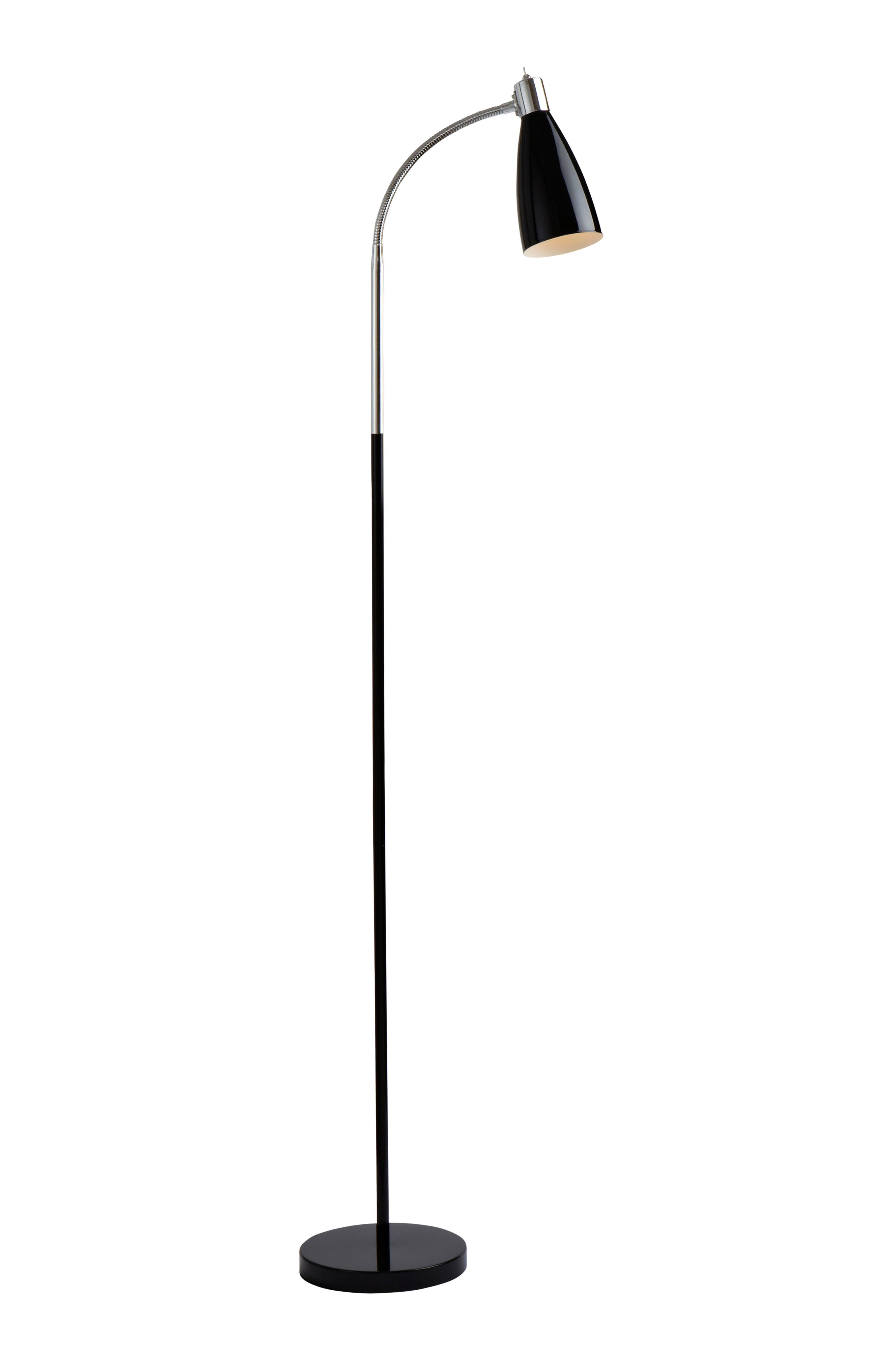 Gulvlampe med bøybar arm og med strømbryter på skjermen. Transparent ledning 170 cm.