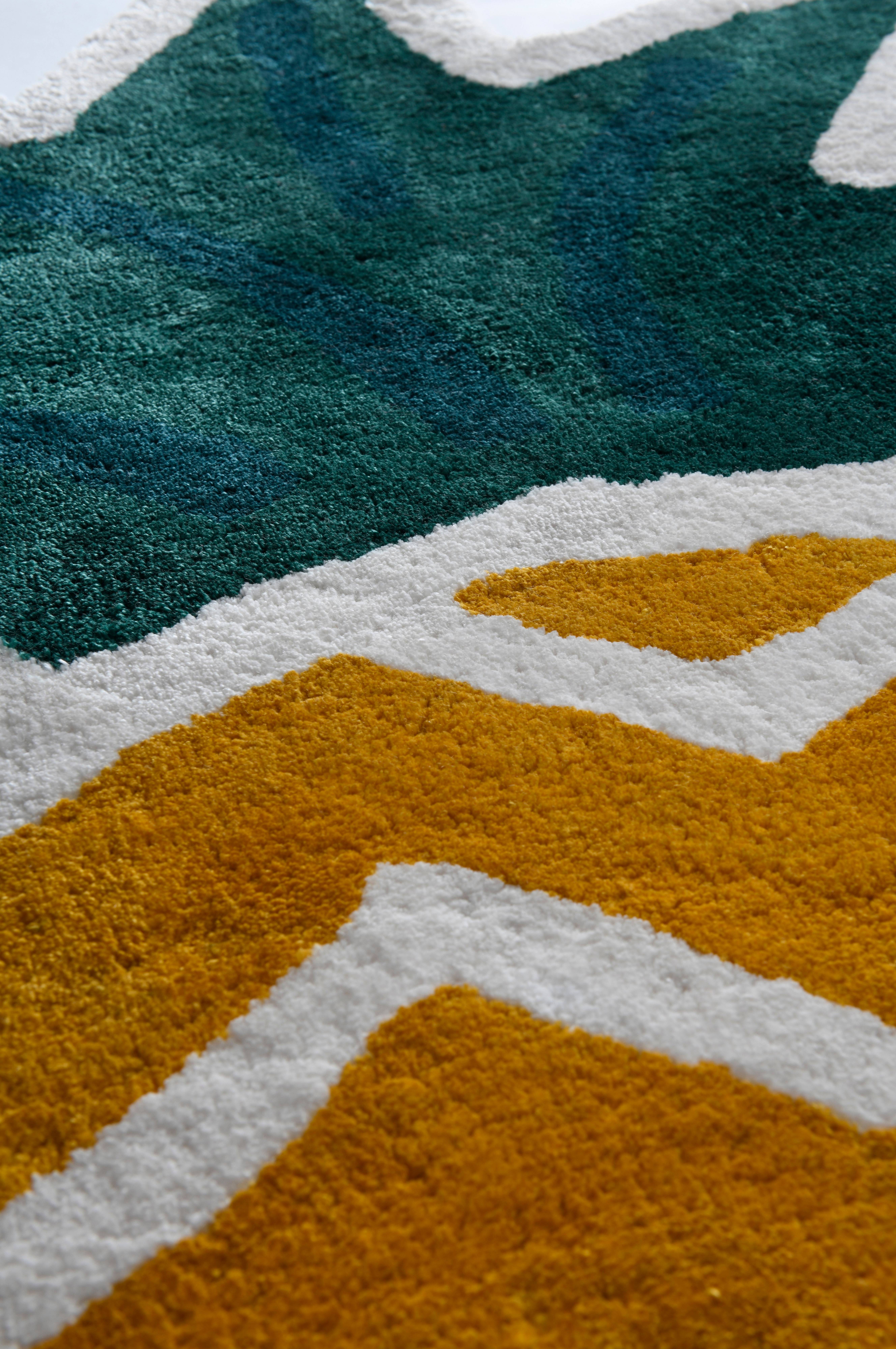 Viskoseteppe med kort lugg og vevd motiv. Lugghøyde 0,8-1 cm. 4600 g/m². Den håndtuftede teppet er formet som en ananas, og er vevd i sterke farger - farge og form piffer opp.