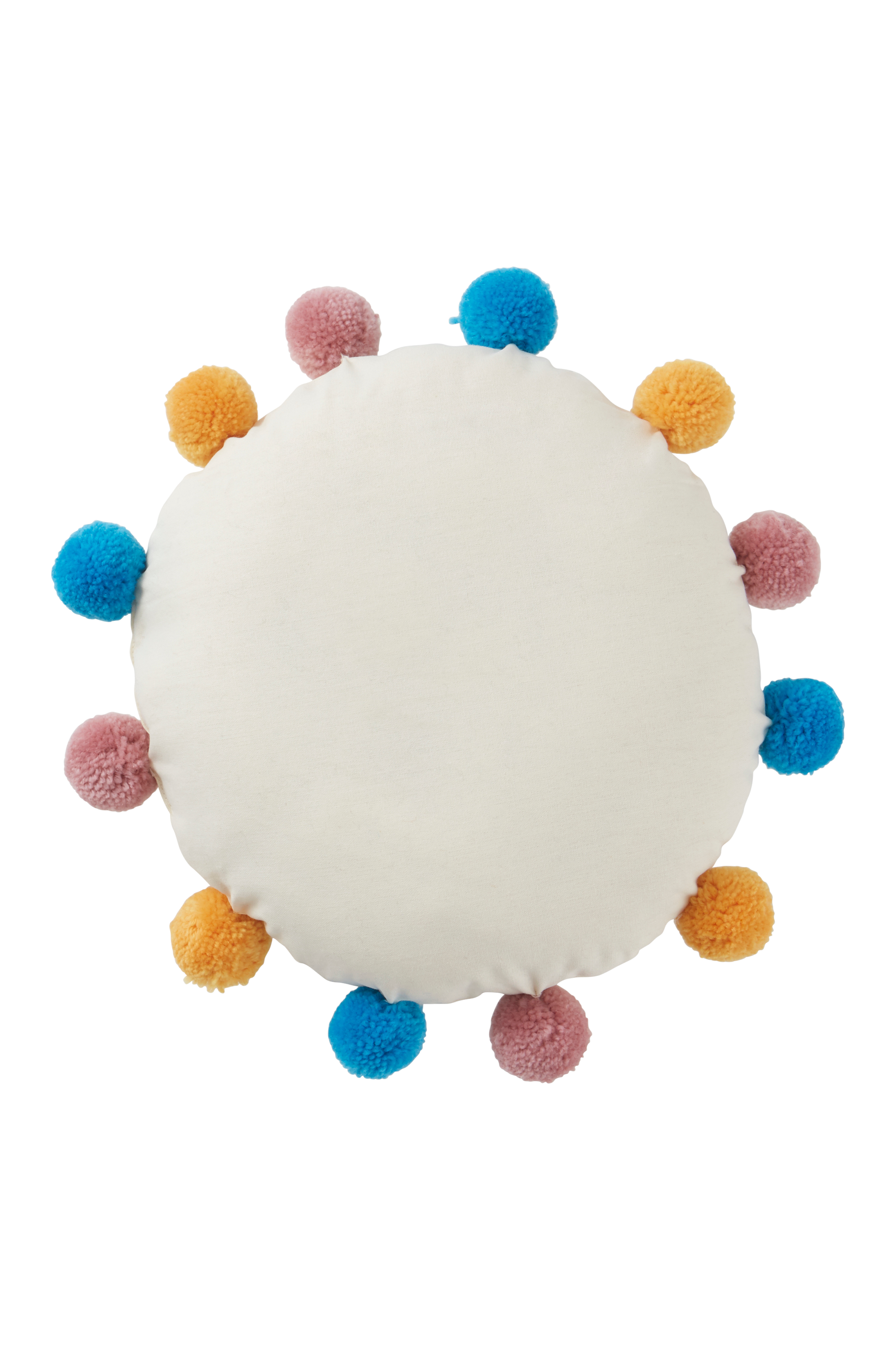 Rund pute i kanvas av bomull med dekorative garnkuler rundt kanten. Myk stopp av polyester. Baksiden er ensfarget, av samme materiale.