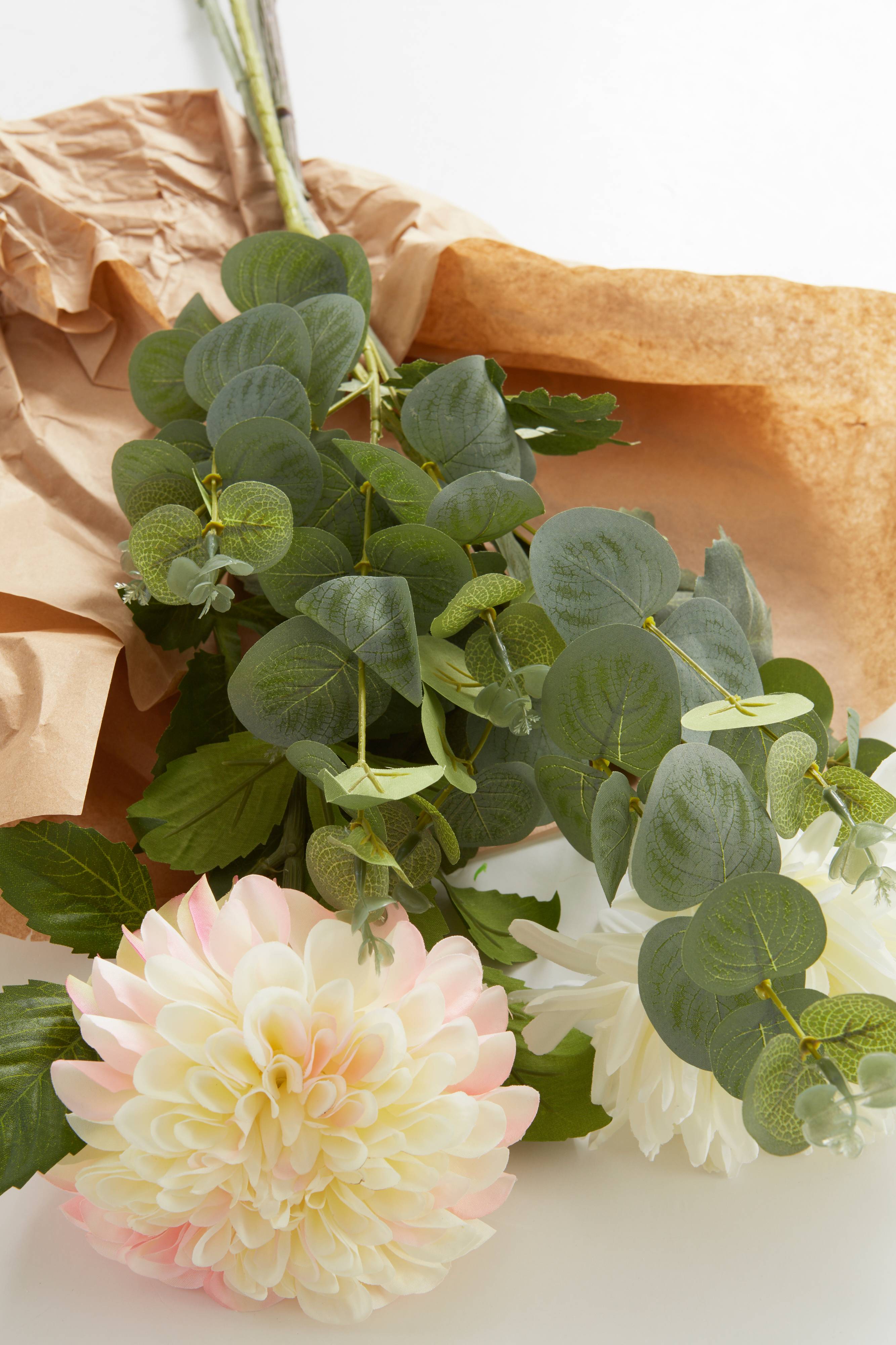Kunstig bukett med dahlia, krysantemum og eukalyptus. Alle buketter bindes for hånd. Buketten er fantastisk naturtro, og 80% av materialet er polyester fra gjenvunnet materiale. Buketten er pakket inn i silkepapir. En kunstig bukett er vakker lenge og visner aldri.