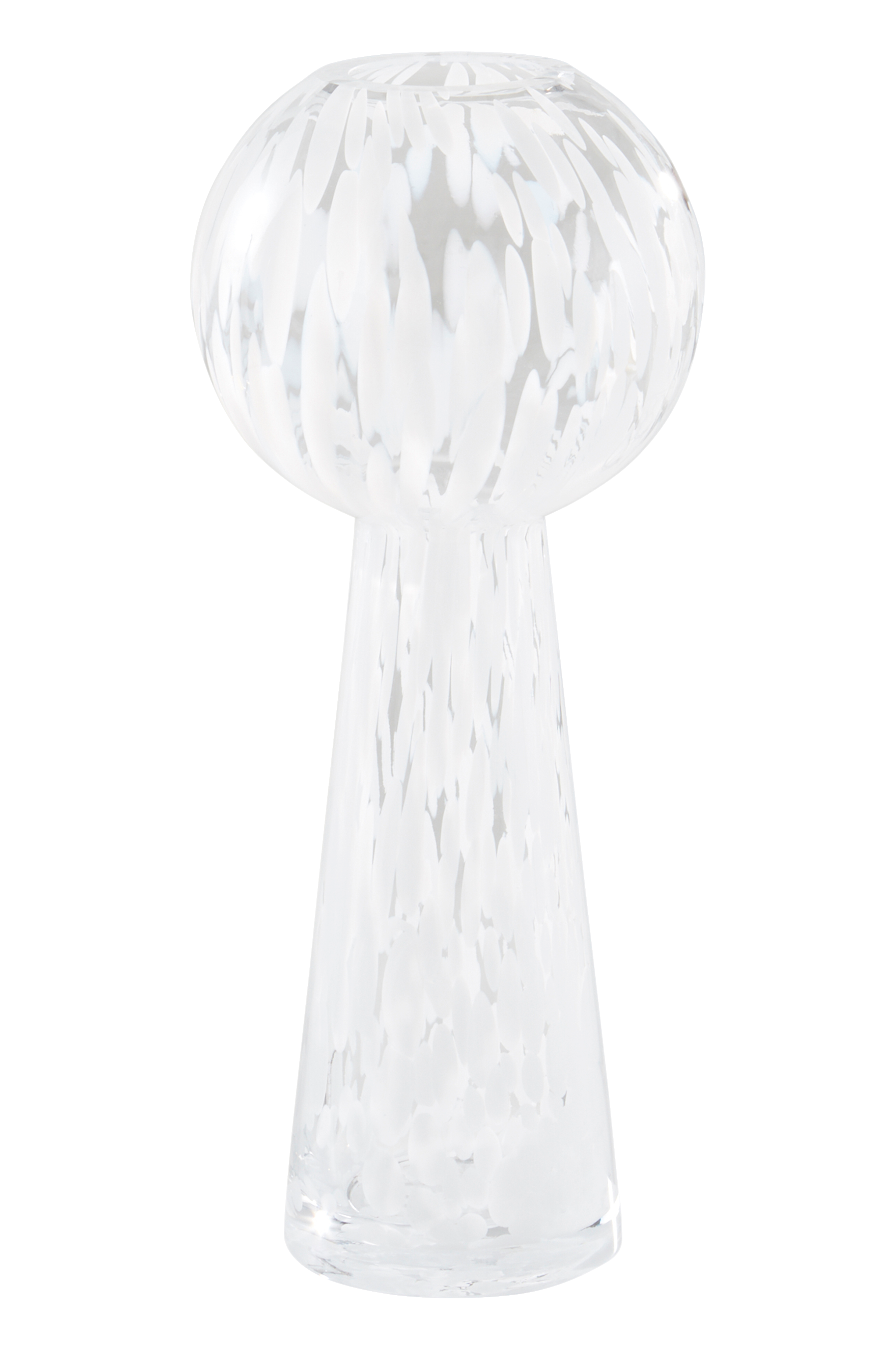 Håndlaget glassvase i klart glass med hvit dekor i glasset. Den spesielt formede vasen løfter frem skjønnheten i høye snittblomster. Håndverket gjør hver vase unik.