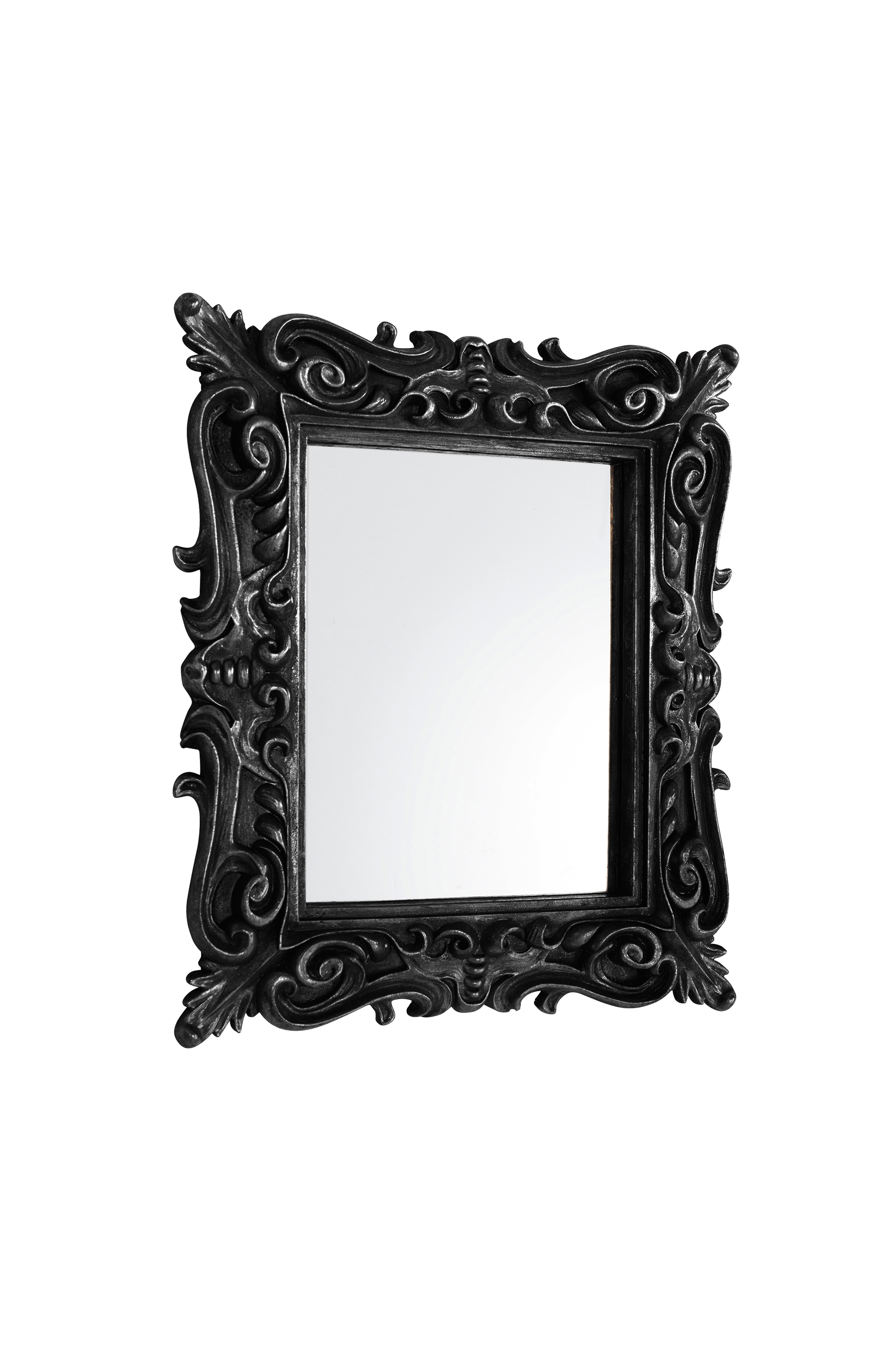 Vakkert ornamentert speil med bred ramme av polyresin med antikkfinish som gjør speilet til et smykke for rommet.