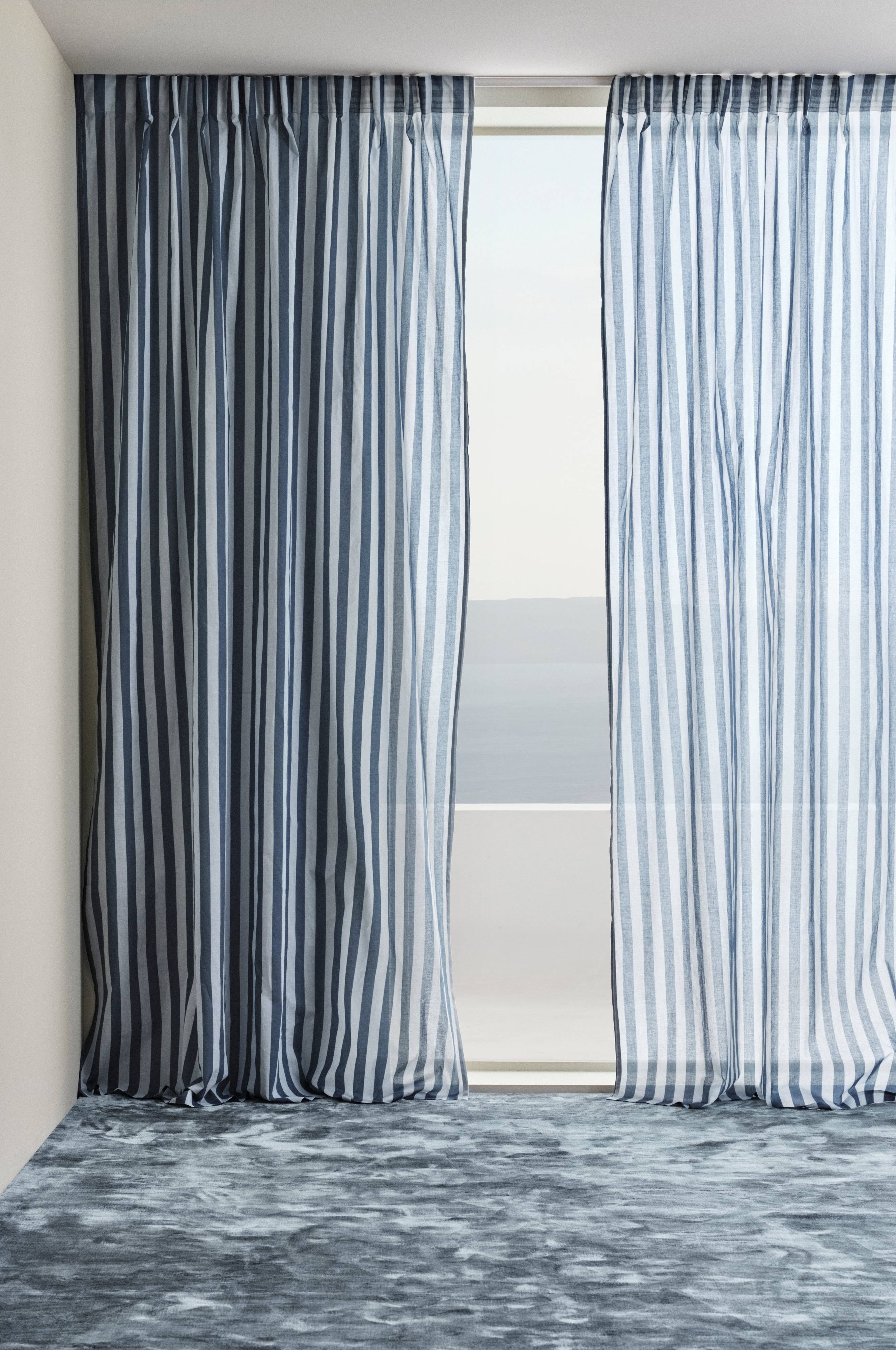 To gardinlengde i bomull med trykte striper. Striper er klassisk og alltid moderne, et mønster som er lett å matche med andre mønstre. Lengdene har påsydd multifunksjonsbånd, og kan henges opp med fingerkroker, kanal samt skjult hempe.