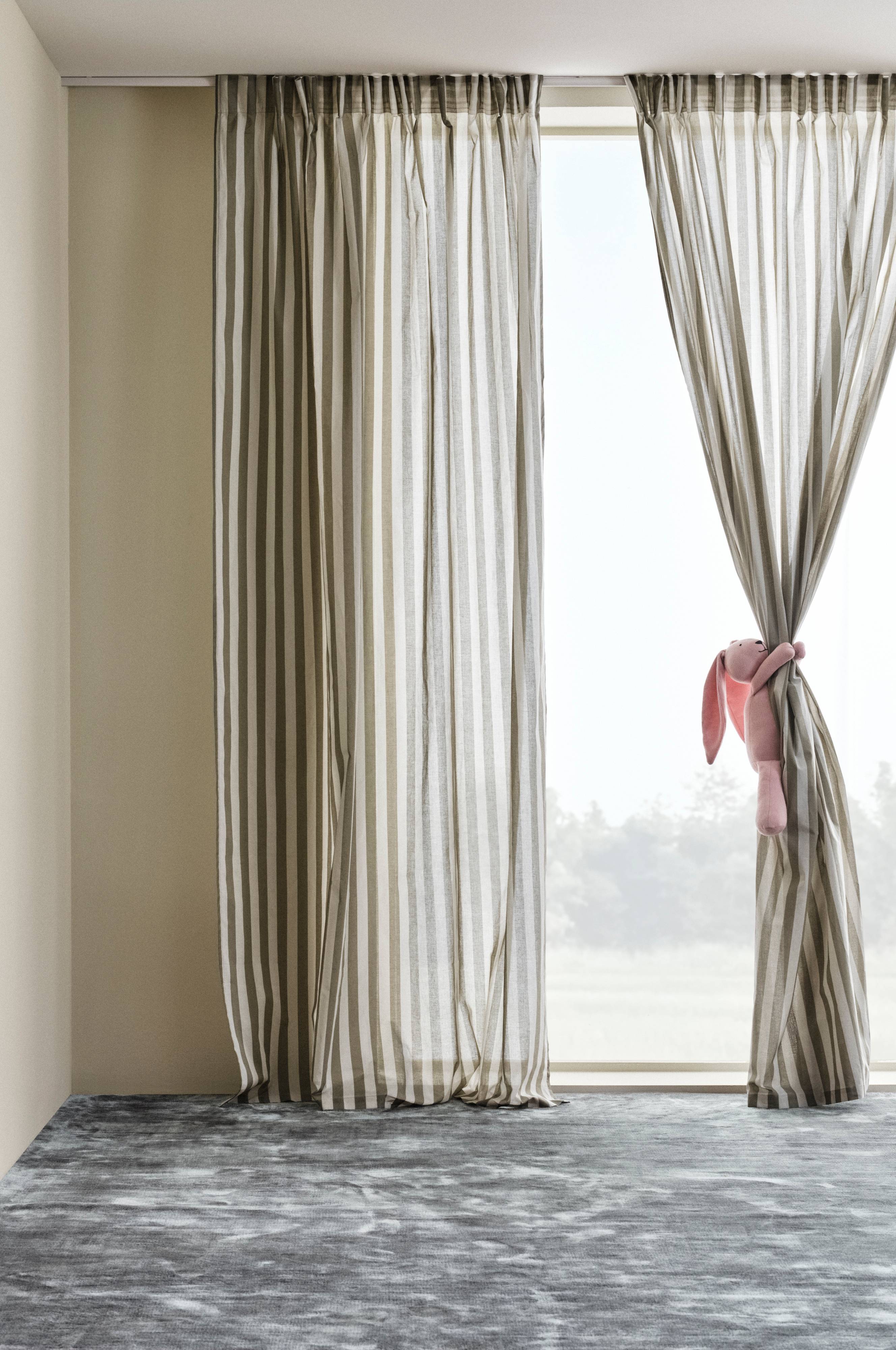 To gardinlengde i bomull med trykte striper. Striper er klassisk og alltid moderne, et mønster som er lett å matche med andre mønstre. Lengdene har påsydd multifunksjonsbånd, og kan henges opp med fingerkroker, kanal samt skjult hempe.