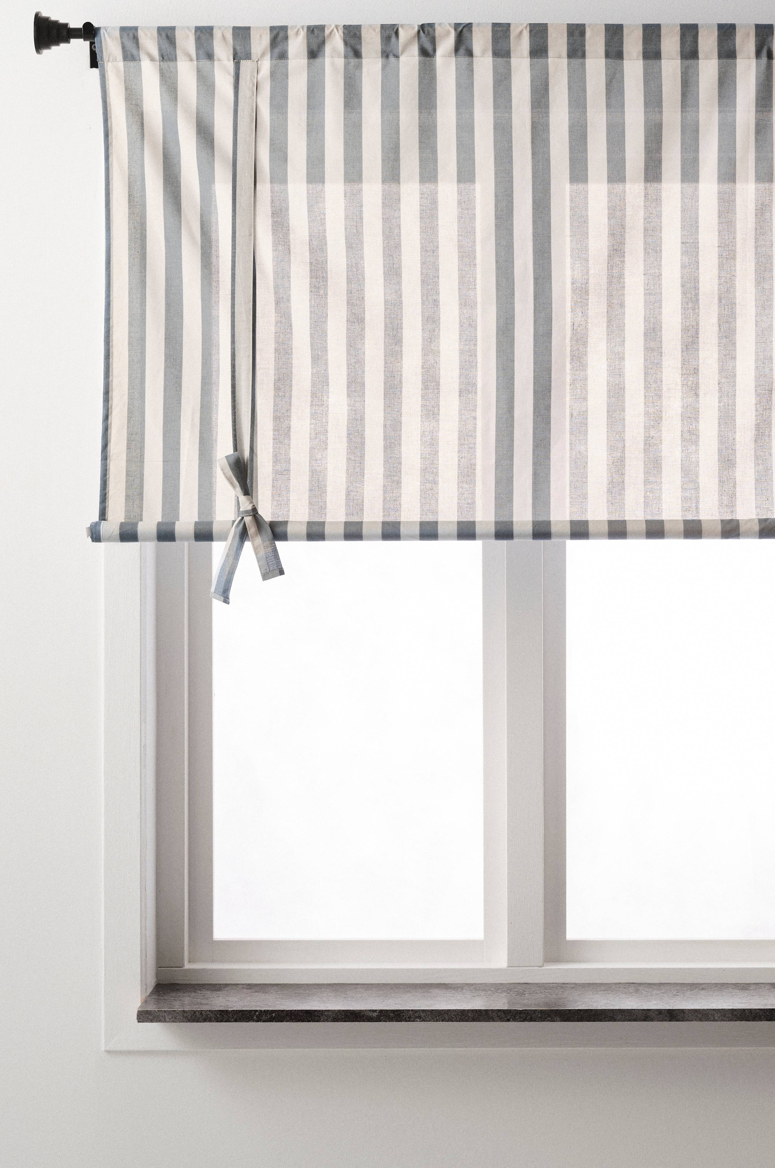 Roll up-gardin i bomull med trykte striper. Striper er klassisk og alltid moderne, et mønster som er lett å matche med andre mønstre. Roll up-gardinen justeres enkelt etter dine ønsker om innsyn. Henges på vanlig gardinstang. Høyden reguleres med knytebånd.