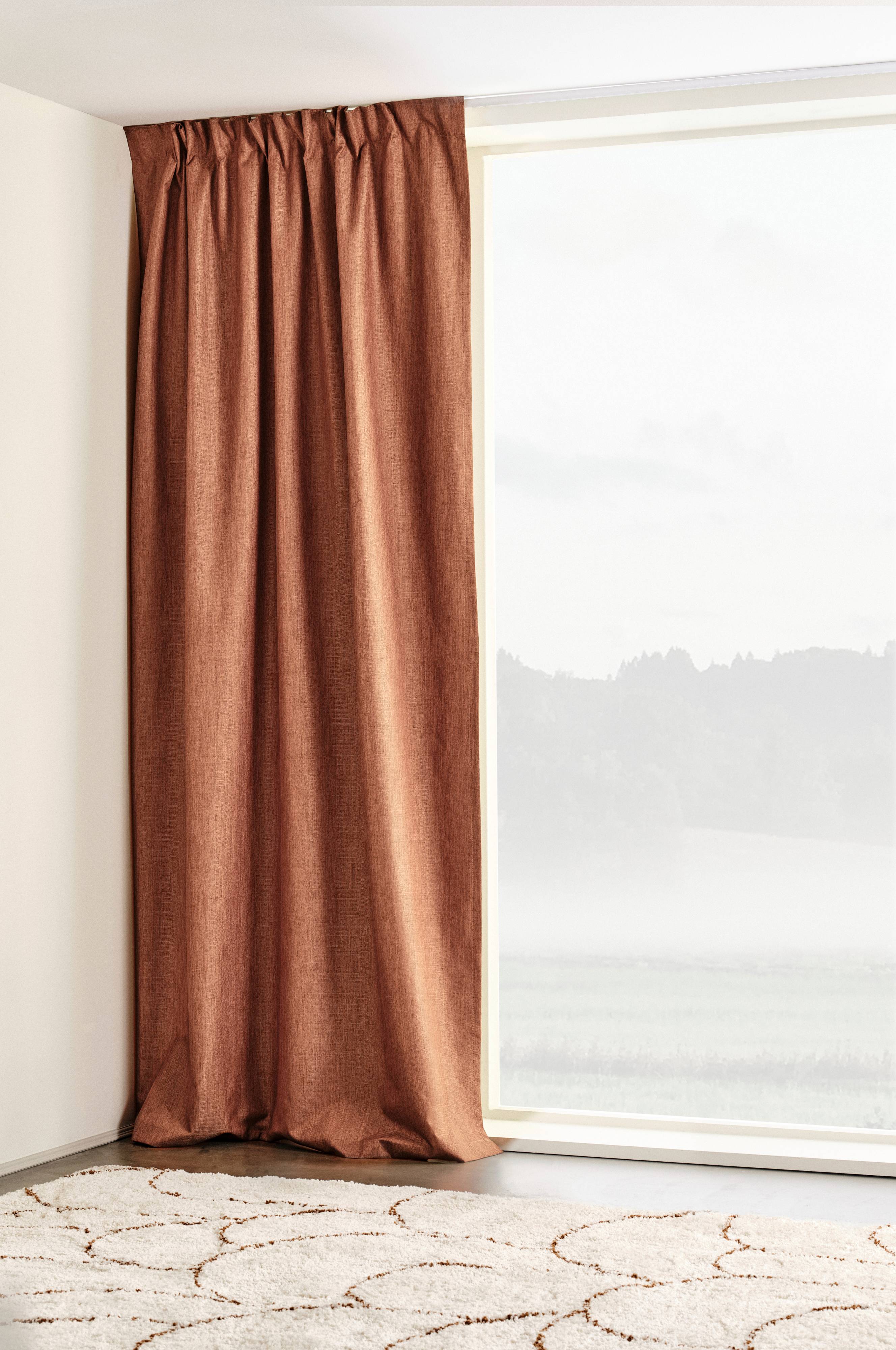 Gardinlengde i polyester med påsydd multifunksjonsbånd. Steng lyset ute når du vil. Mørkleggingsgardinen har struktur, matt overflate og samtidig glans i trådene noe som skaper en unik følelse i rommet. Lysblokkerende belegg på baksiden. Multifunksjonsbåndet gir deg muligheten til å variere opphengingen med rynkebånd, skjult stropp og leggbånd.