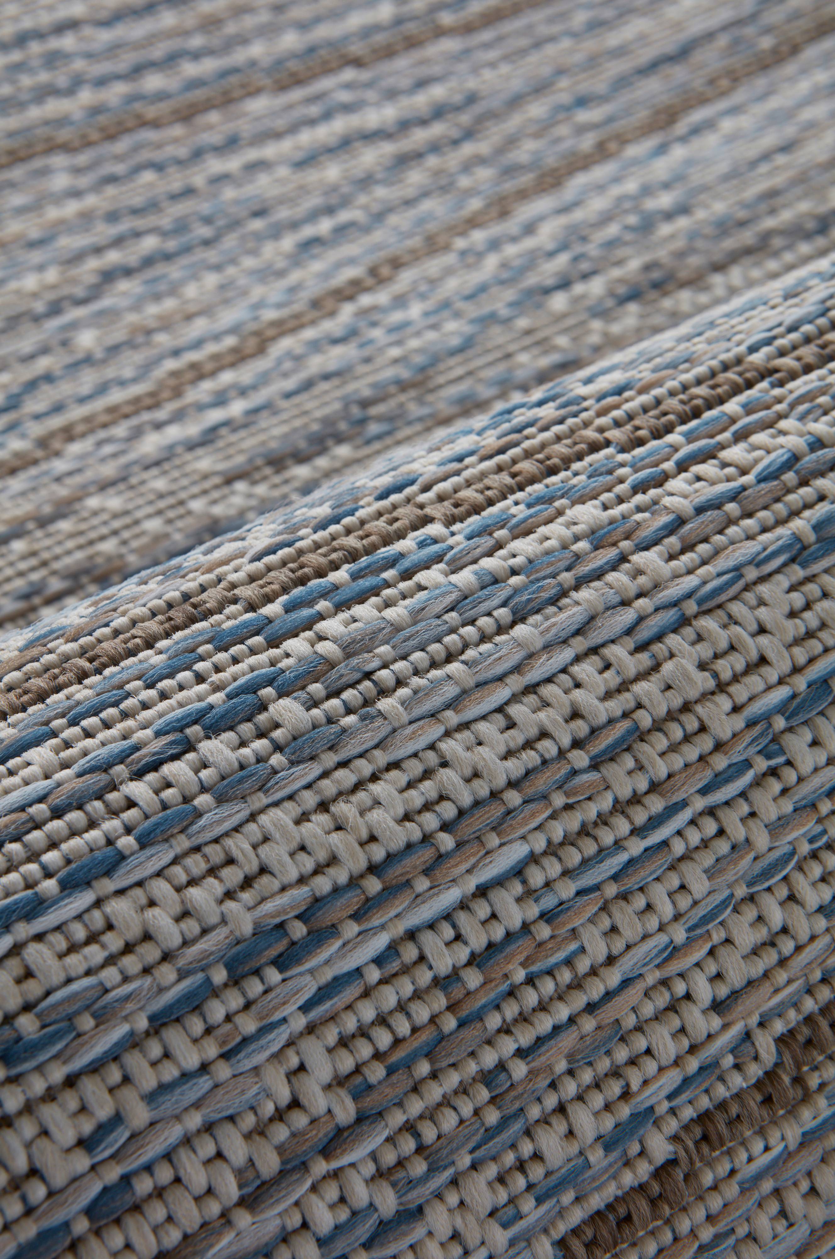 Glattvevd teppe av polypropylen med iblandet polyester. Teppet har et diskre bølgemønster på melert bunn. Det gjør det lett å plassere i ulike rom, og gjør dessuten teppet mindre ømfintlig mot flekker. RIMINI er vevd i en robust kvalitet, og passer like fint innendørs som utendørs. Teppet er svært lettstelt, og passer også fint i rom hvor det utsettes for stor slitasje som for eksempel kjøkken, gang og vaskerom. Balkongen og terrassen blir ekstra koselig og lun med tepper på gulvet. Tykkelse: 0,6 cm. 1270 g/m².