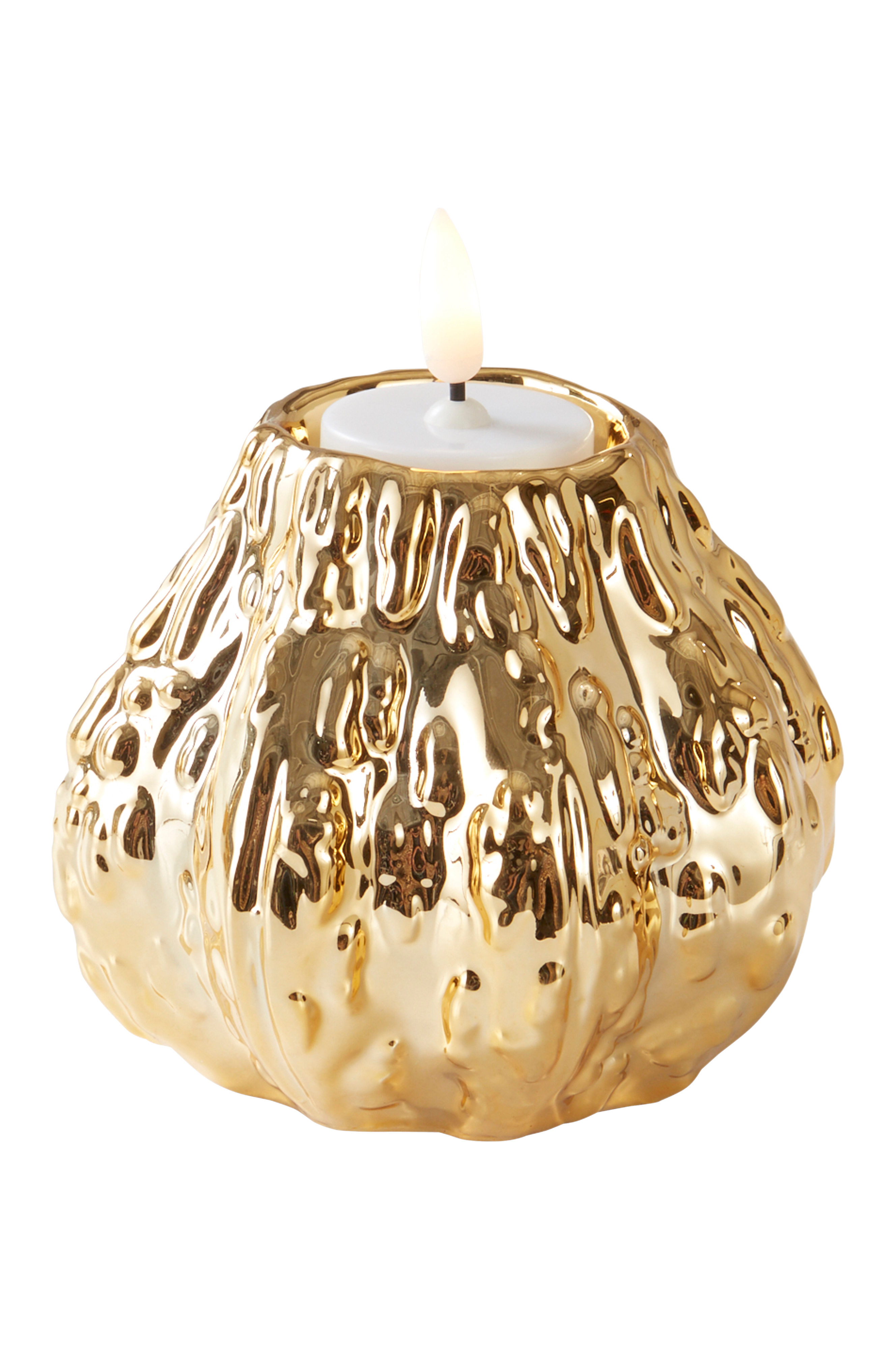 Dråpeformet lysestake av porselen i høyblank gullfarge. Lys medfølger ikke.