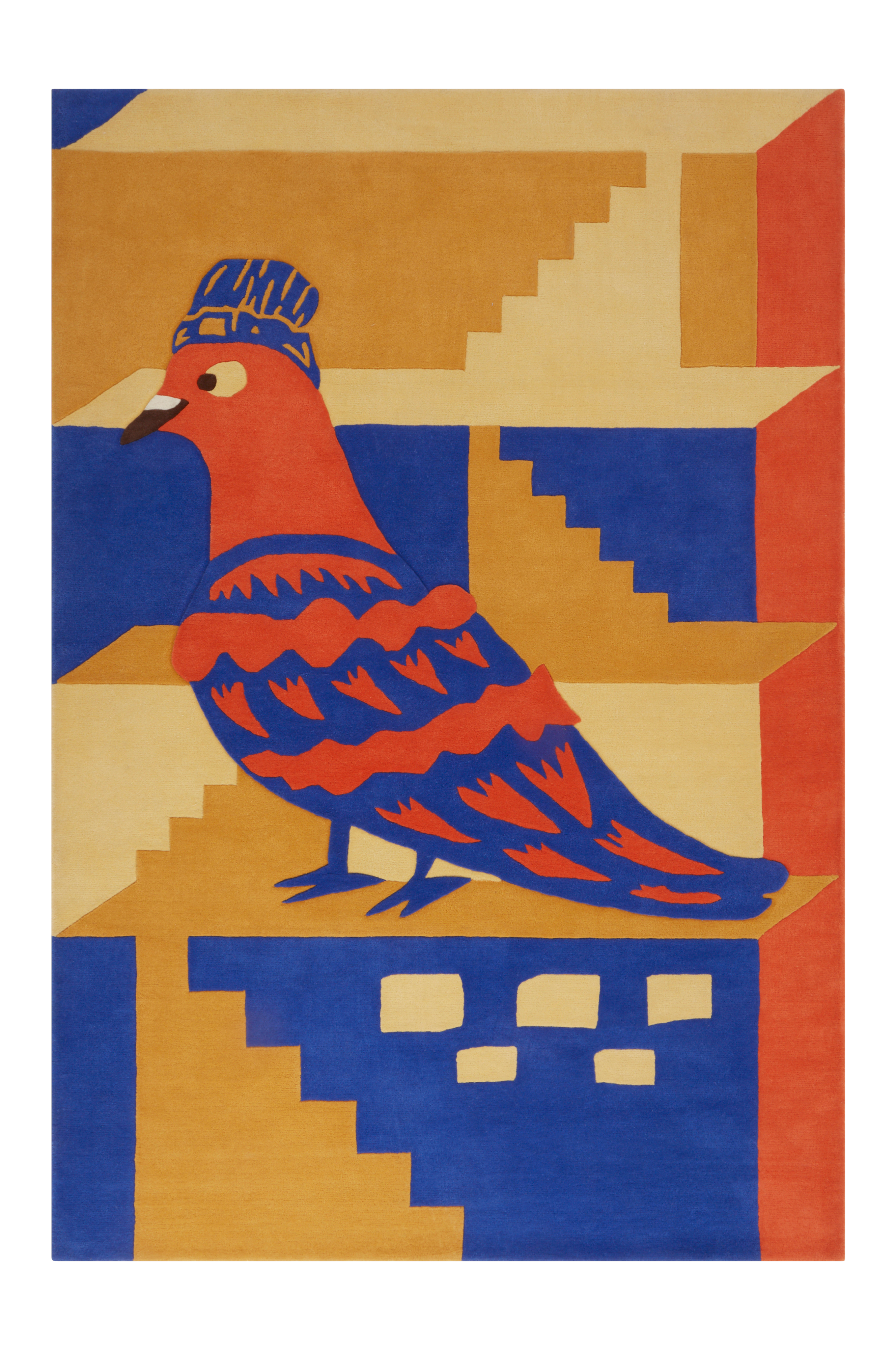 ROOF PIGEON er et ullteppe i unik design av Mikael Selin. Ullteppet er håndtuftet, og motivet er en stor, fargerik bydue. Innrammingen er inspirert av et torg med høye hus og trapper. Mønsteret er like abstrakt som konkret, og her møtes kontraster. Myke, organiske former blandes med kantede mønstre.