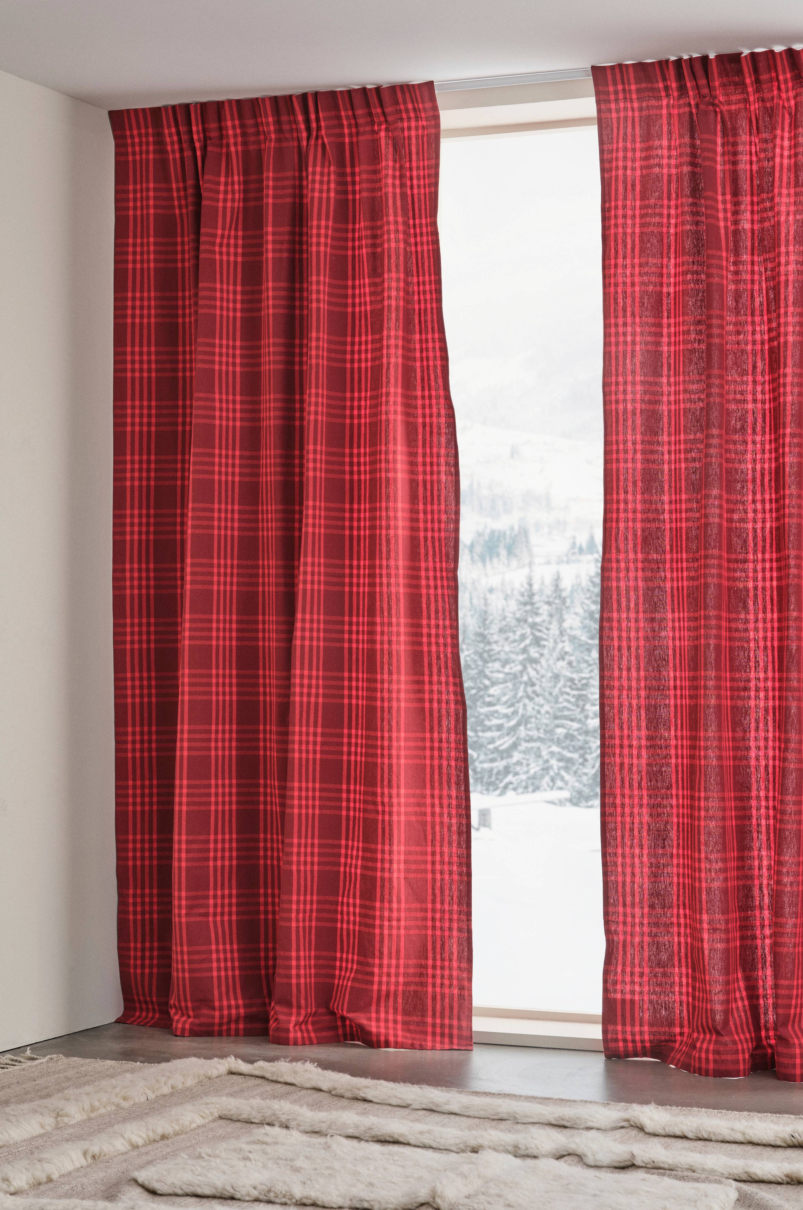 To gardinlengder i kraftig og tettvevd bomullskvalitet. Lengdene har hjemmekoselig, garnfarget rutemønster. Påsydd multifunksjonsbånd øverst gjør det mulig å henge opp gardinen med fingerkroker, kanal samt skjult hempe.