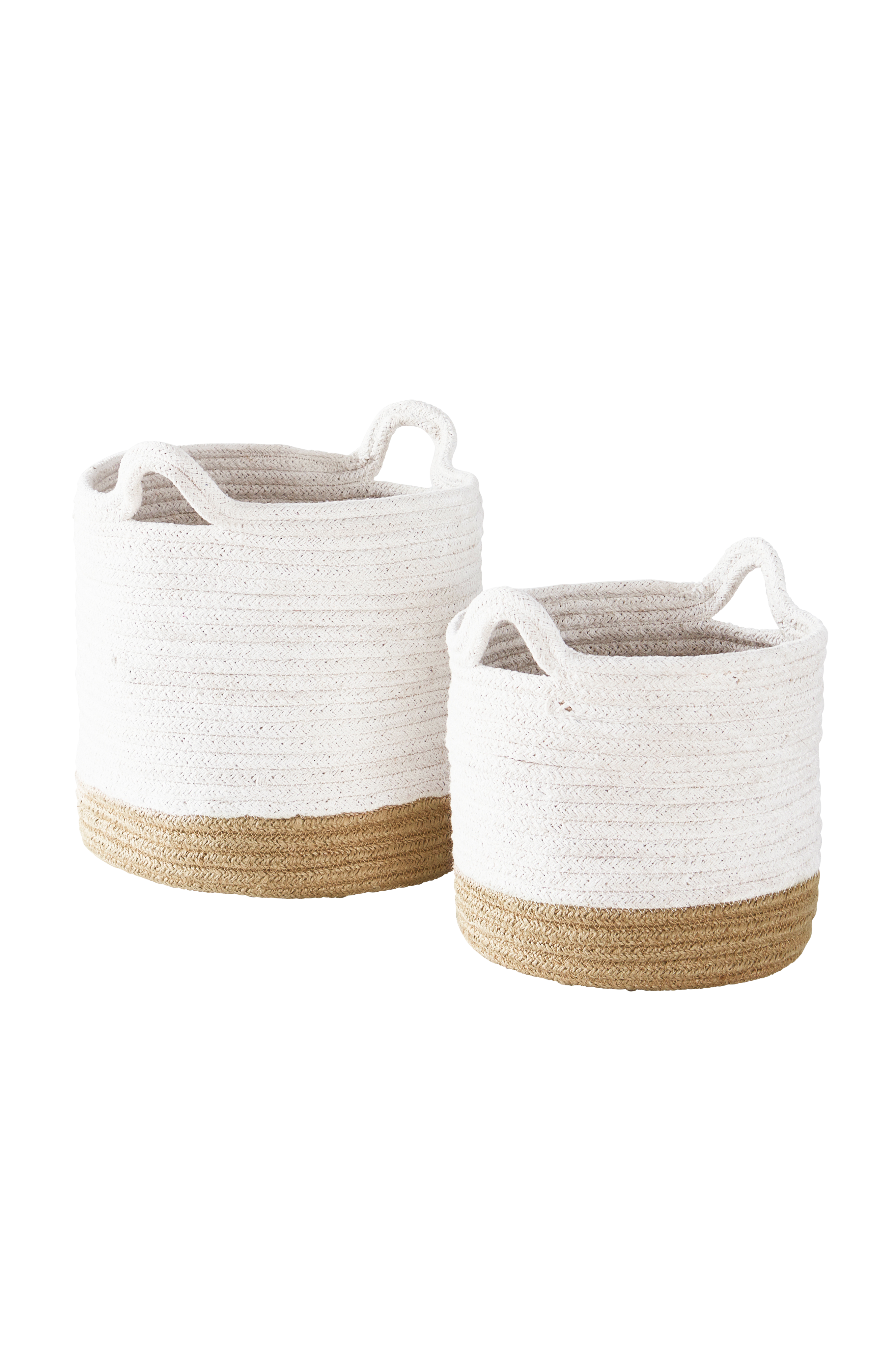To dekorative oppbevaringskurver i kraftig bomull med bunn i jute. Passer også som potteskjuler for en avslappet interiørstil.