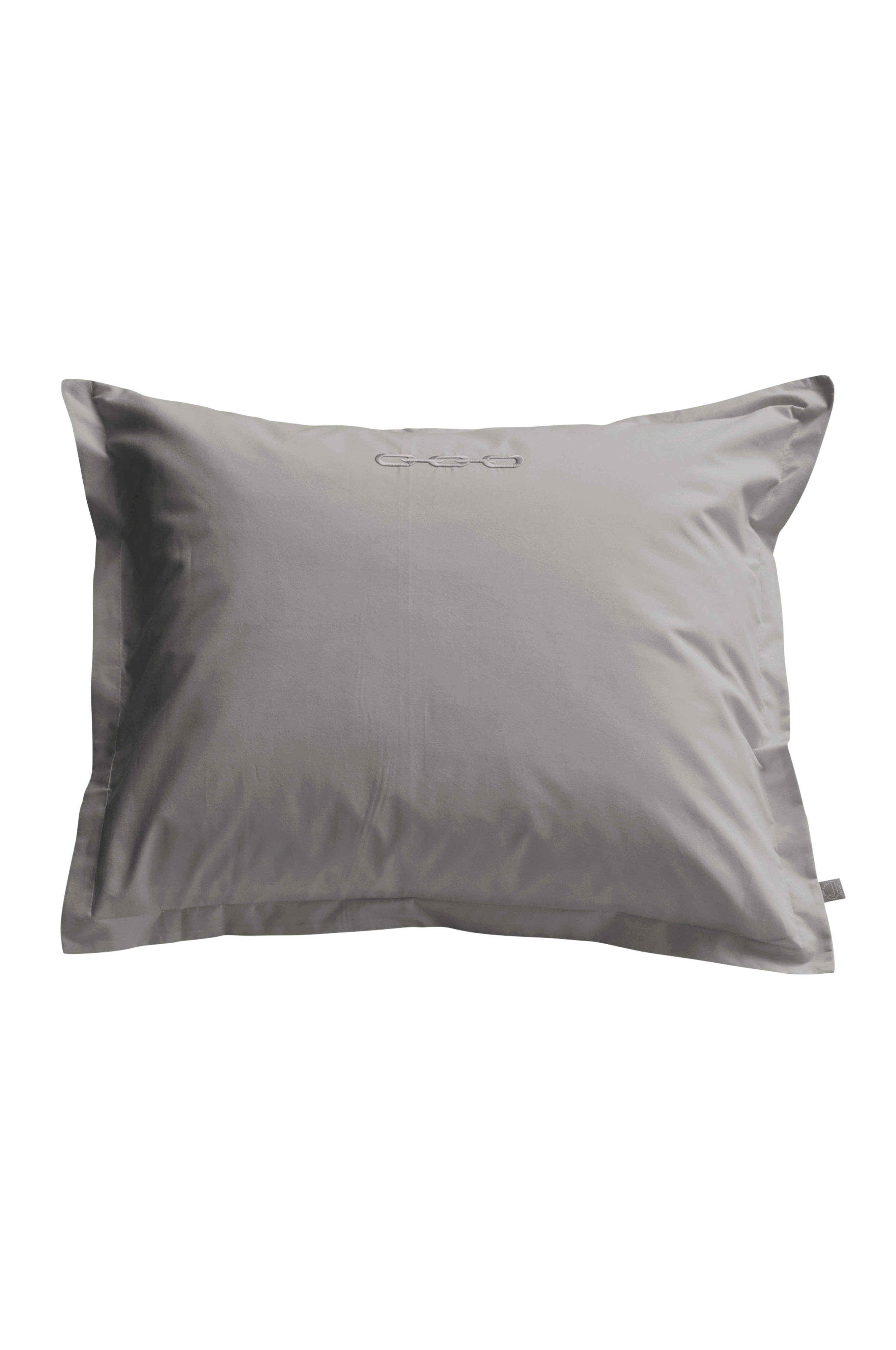 Putevar i ensfarget bomullspercale med brodert mønster. Trådtetthet på 200 tc. (Trådtettheten forteller om antallet tråder, thread counts, pr. kvadrattomme i et stoff. Jo høyere trådtetthet, desto høyere kvalitet).