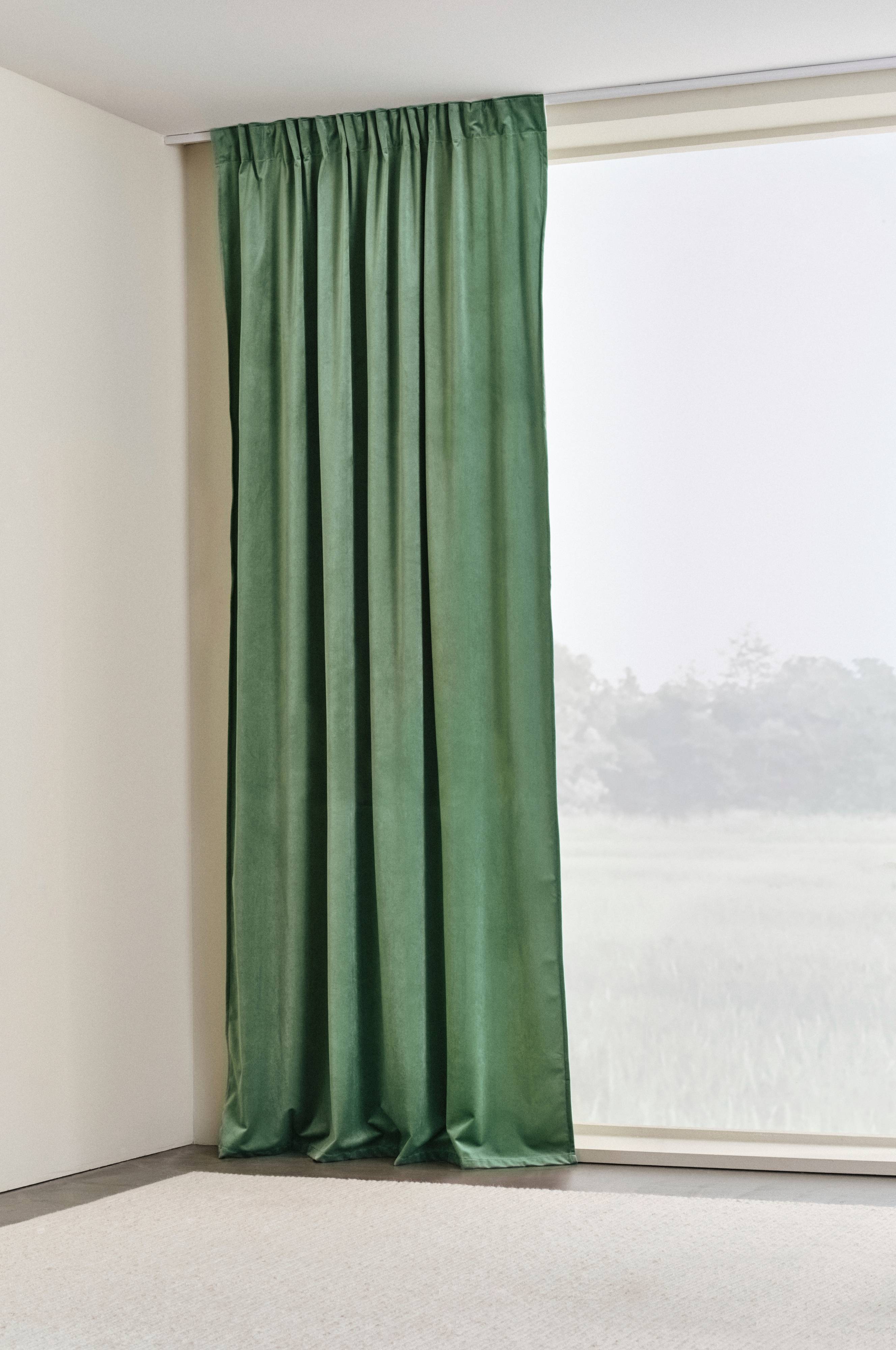 En gardinlengde i ensfarget polyesterfløyel. Fløyel har en fin glans og en myk følelse, og fargen skimrer vakkert i ulike lys.