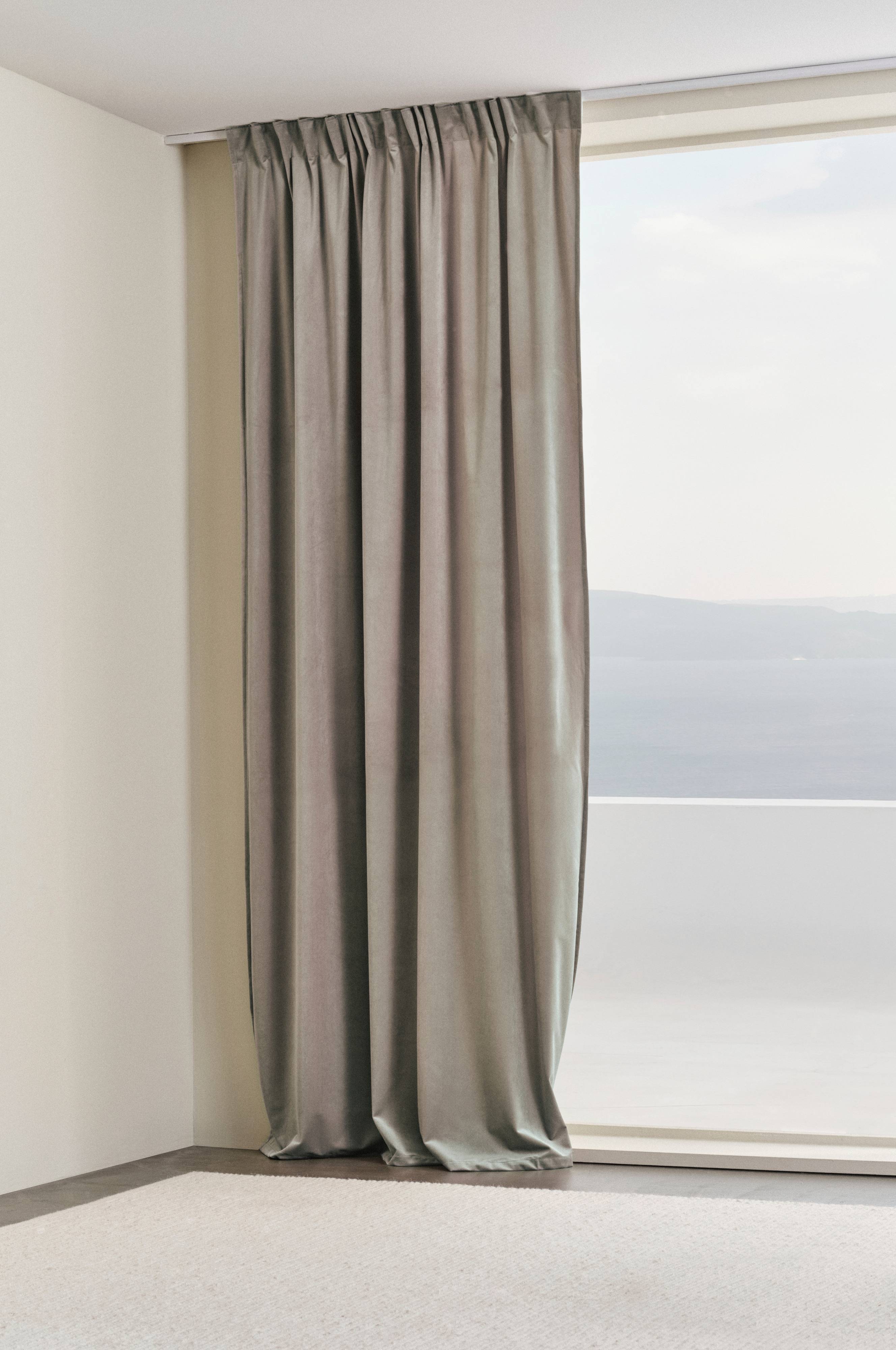 En gardinlengde i ensfarget polyesterfløyel. Fløyel har en fin glans og en myk følelse, og fargen skimrer vakkert i ulike lys.
