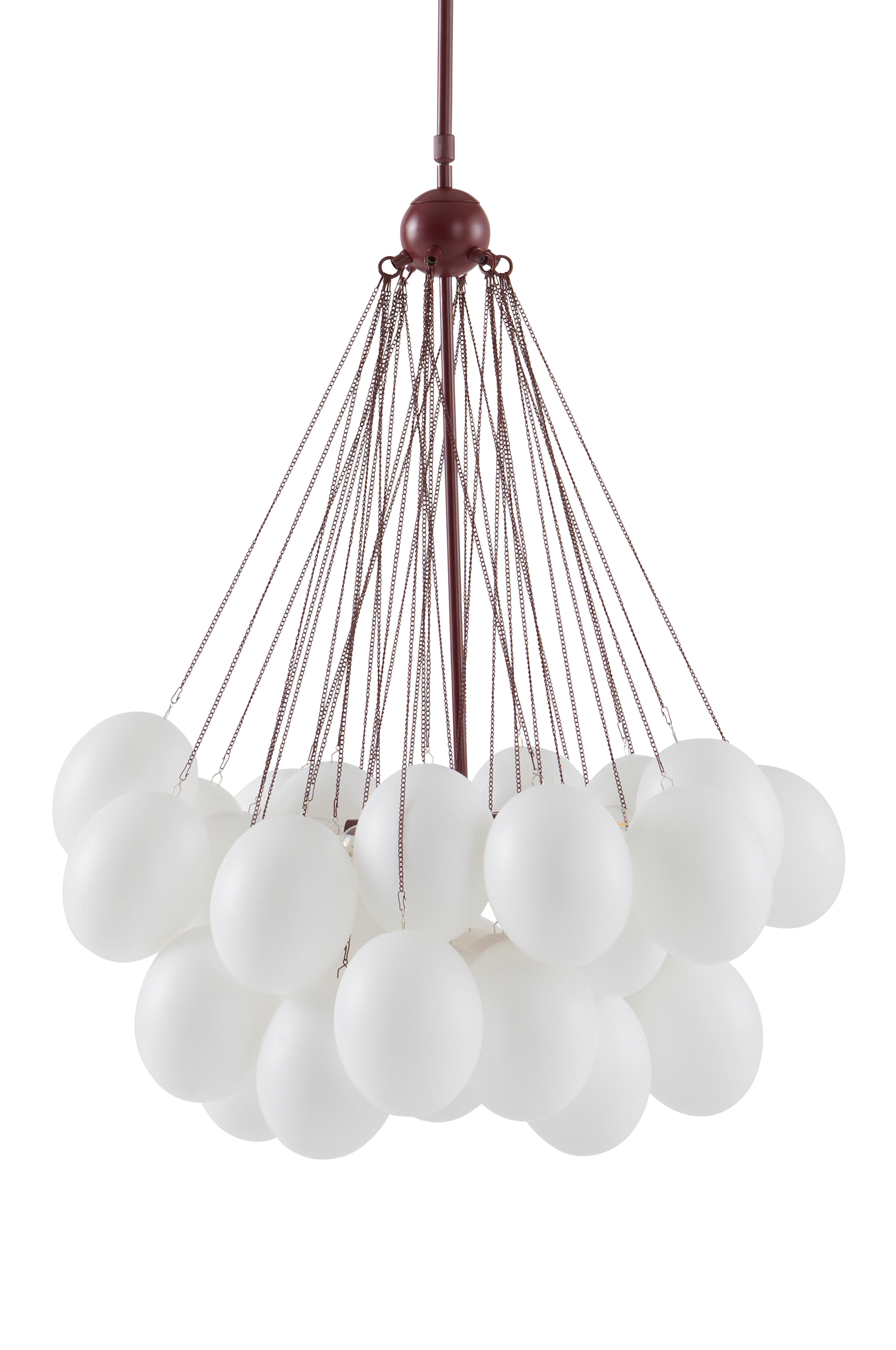Taklampe med 37 runde kuler av opalglass, i seks av kuplene er det en lysestake som gjør at lampen sprer et behagelig lys. Kuplene henger i en fin klynge og danner en flott og spennende taklampe over f.eks. spisebordet. Stativet og takkoppen er laget av jern.