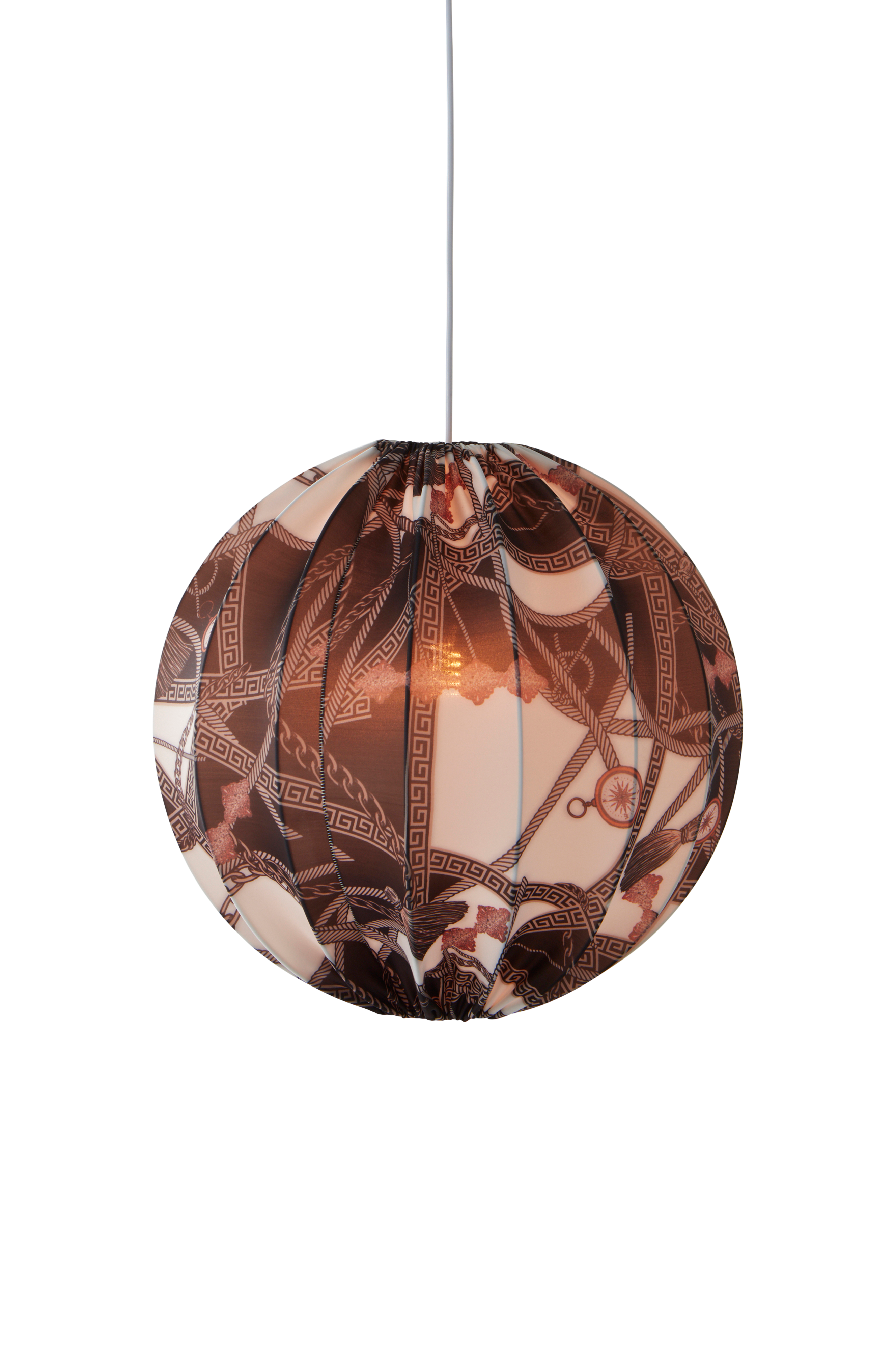Taklampe av mønstret stretchstoff og metallstamme. Hvit ledning, ledningslengde 1,2 m. Takkontakt inngår ikke pga. nye EU-regler. Den kan kjøpes separat, og heter ROOF EARTH takkontakt.