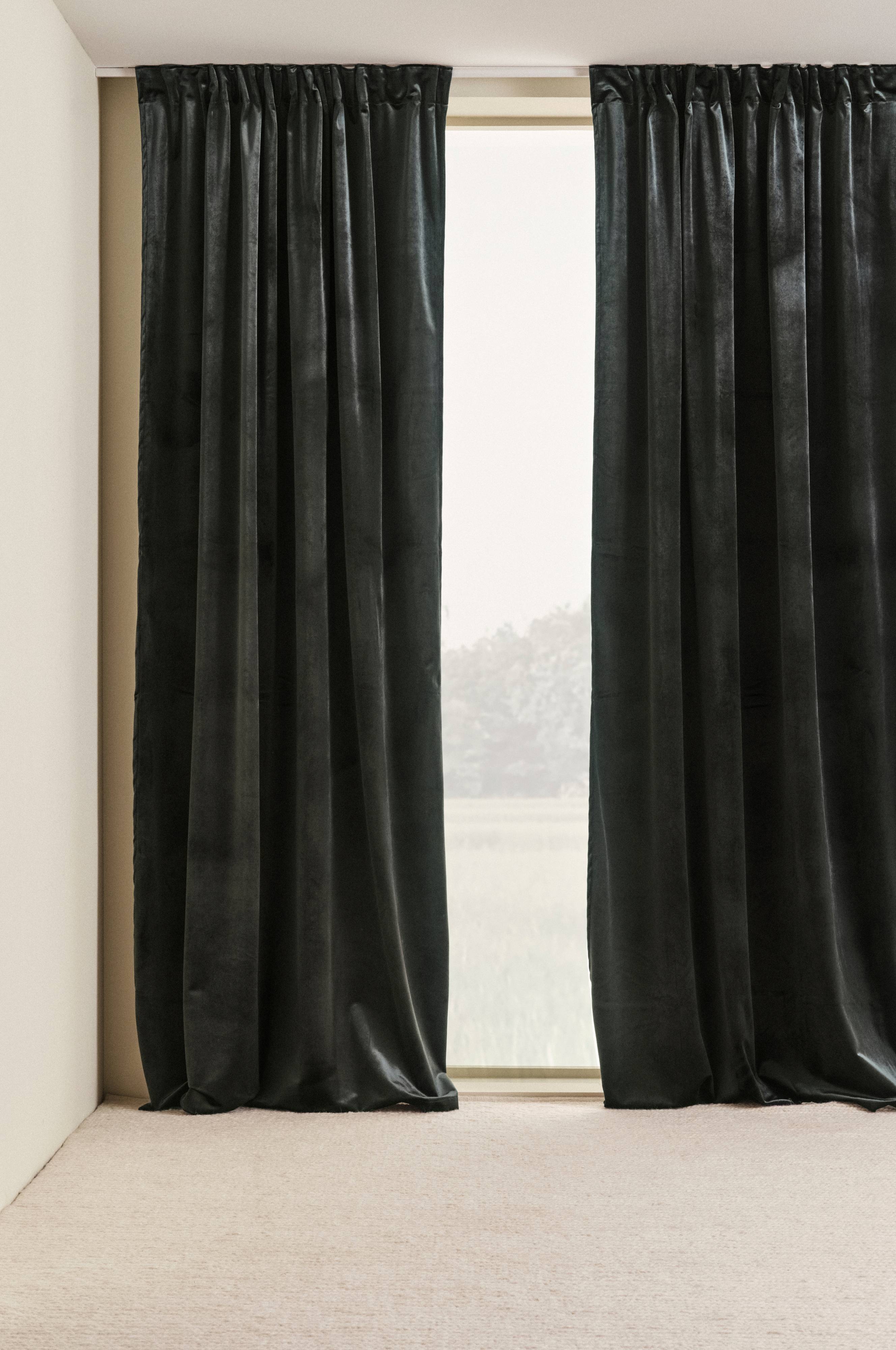 To gardinlengder i elegant fløyel av polyester. Fløyelen skimrer vakkert. Fargenyansen oppleves ulik avhengig av hvordan lyset faller. Lengden har påsydd multifunksjonsbånd. Gardinen kan henges opp med fingerkroker, løpegang samt skjulte hemper.