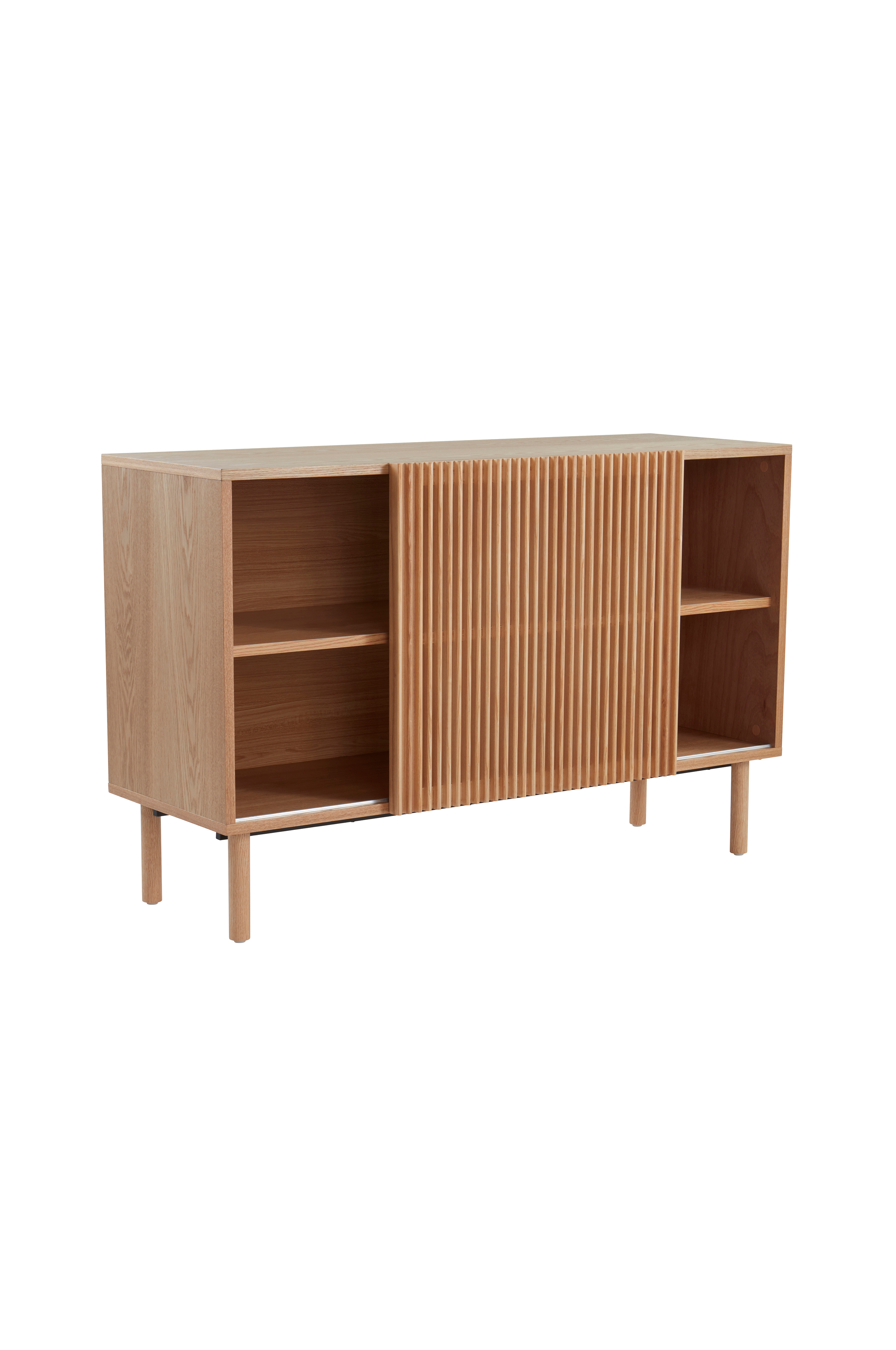 Skap med en skyvedør og ben av massiv ask, stamme av MDF med askefinér. Skapet gir en naturlig følelse med sin skandinaviske stil med en touch av retro. Den stilrene døren består av ribber av ask med avrundet kant, og det oppstår en lett gjennomsiktighet i mellomrommene. Skyvedøren skjuler halve skapet, og resterende del blir åpne hyller for fin eksponering. Skapet har en fast hylle. Rette, runde ben gir en nett følelse. Skruer medfølger. Noe montering kreves. Monteringsanvisning medfølger.