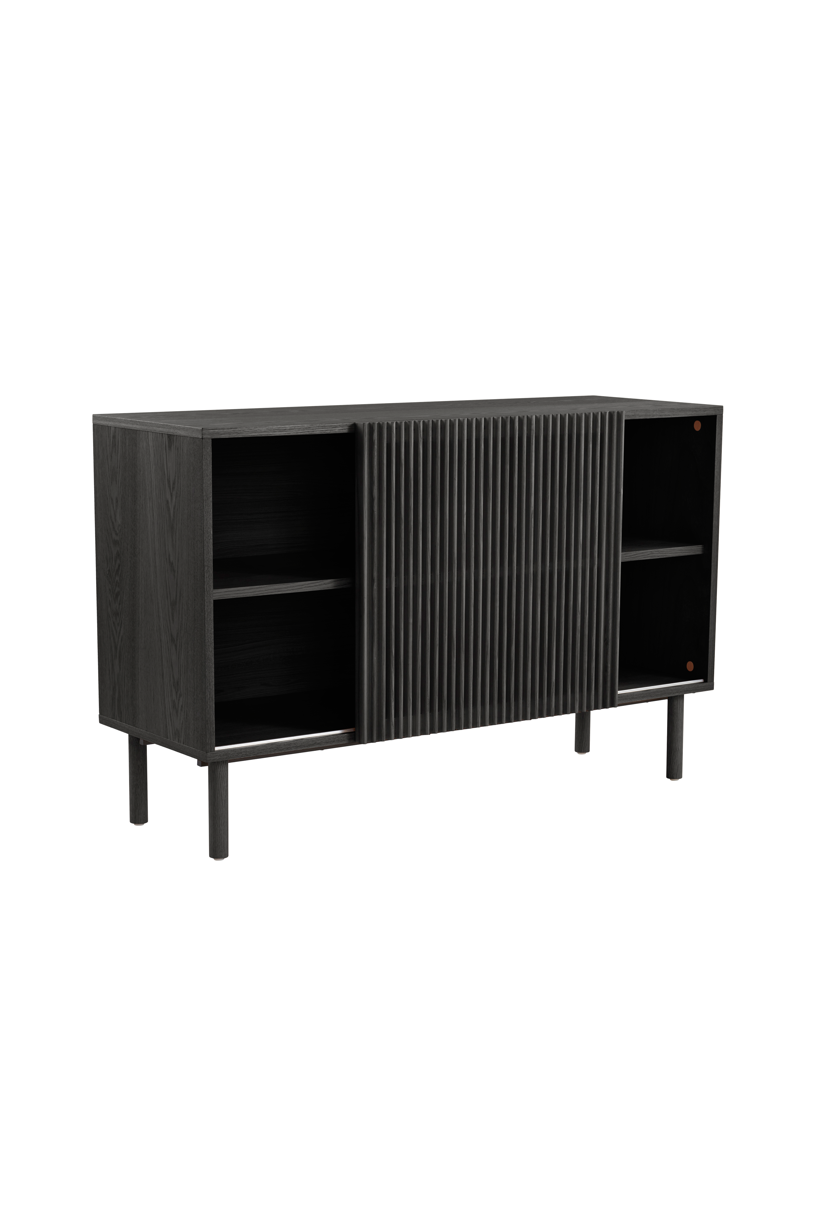 Skap med en skyvedør og ben av massiv ask, stamme av MDF med askefinér. Skapet gir en naturlig følelse med sin skandinaviske stil med en touch av retro. Den stilrene døren består av ribber av ask med avrundet kant, og det oppstår en lett gjennomsiktighet i mellomrommene. Skyvedøren skjuler halve skapet, og resterende del blir åpne hyller for fin eksponering. Skapet har en fast hylle. Rette, runde ben gir en nett følelse. Skruer medfølger. Noe montering kreves. Monteringsanvisning medfølger.