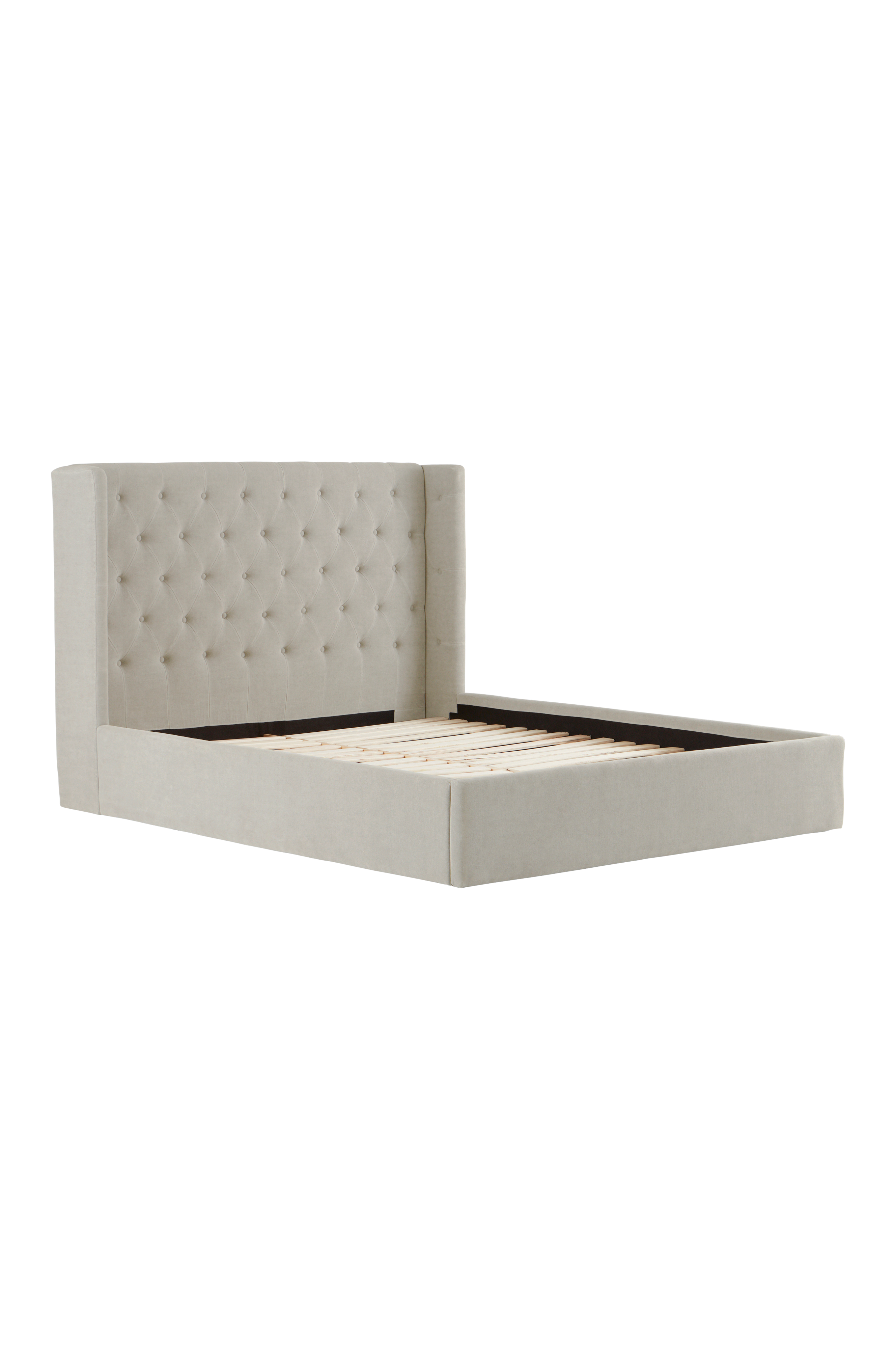 Sengeramme kledd i vakkert linstoff med myk vattering. Sengegavlen har dekorative, dypt heftede, kledde knapper, og vinge på hver side skaper en koselig innramming. Sidene og fotgavlen er stilrent glatte, og rammen rundt sengen går nesten helt ned til gulvet - bare en liten luftspalte gjør at luften kan sirkulere under sengen. Sengerammen har ribbebunn av furu. Kompletter med ønskede madrasser. Madrass/springfjærmadrass er ikke inkludert.