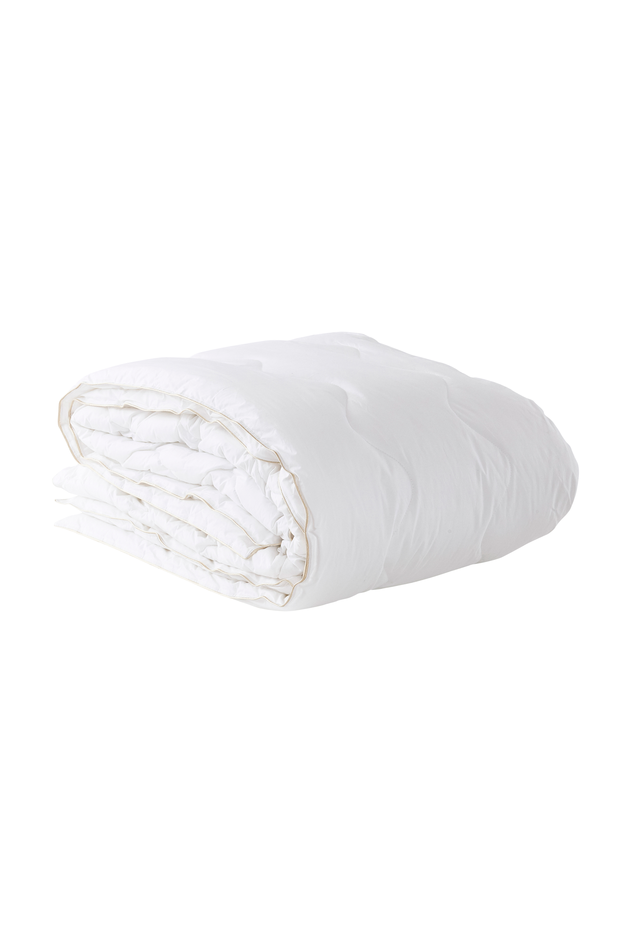 Beskrivelse: Ensfarget dyne for dobbeltseng i mykbehandlet bomullspercale. Fyllet består av polyester med 3D-fiber, noe som gjør det tykt og fyldig men svalt. Dobbeltsøm og passepoilkant av sateng rundt. Dynen er forkrympet og behandlet slik at dynen blir myk, smidig og ikke knitrer. Sydde mellomvegger for å holde fyllet på plass. Leveres i en stoffveske. J-Premiumetikett påsydd. Vekt: 1250 gram.