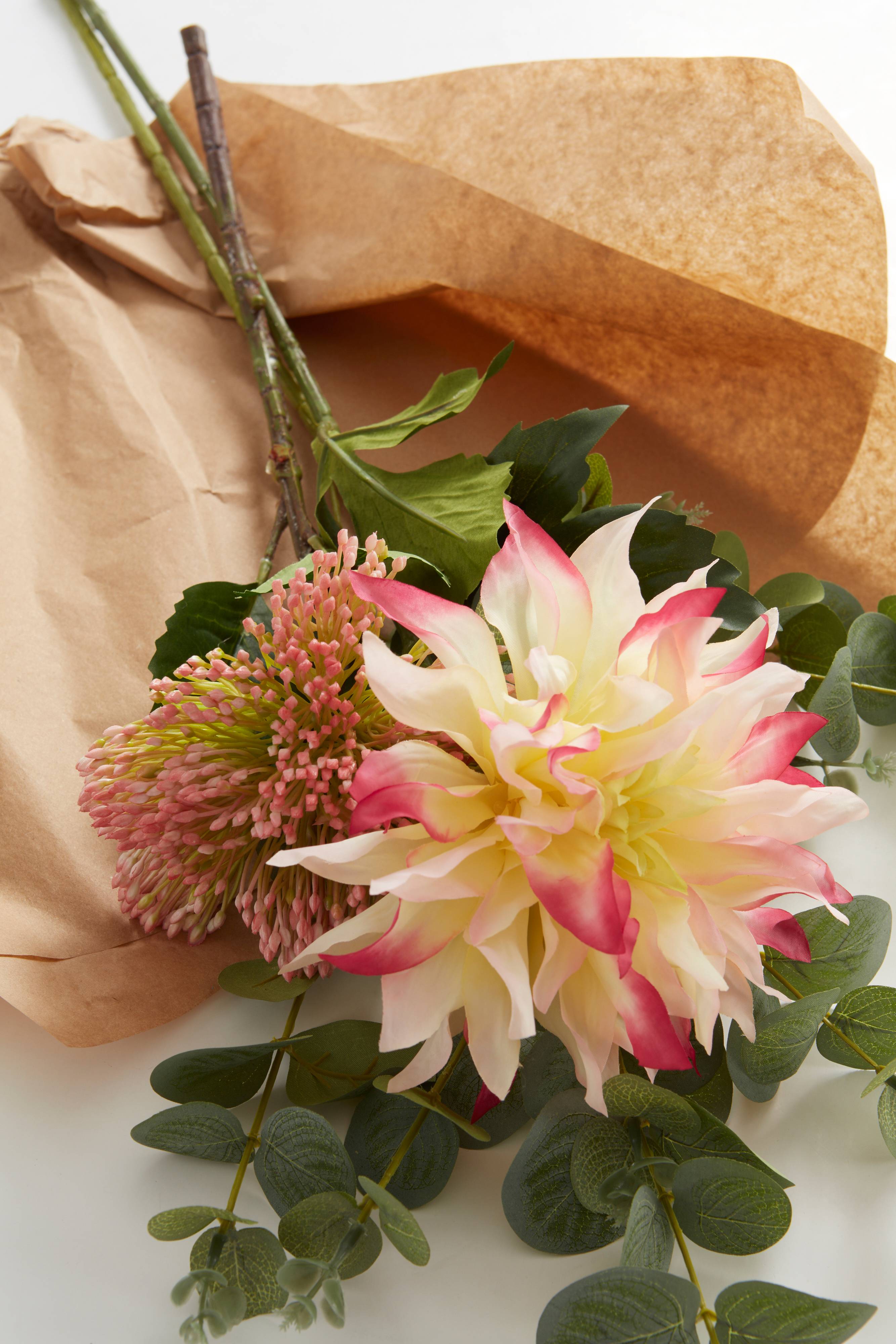 Kunstig bukett med en dahlia, en sedum og en eukalyptus. Alle buketter bindes for hånd. Buketten er fantastisk naturtro, og 70% av materialet er polyester fra gjenvunnet materiale. Buketten er pakket inn i silkepapir. En kunstig bukett er vakker lenge og visner aldri.