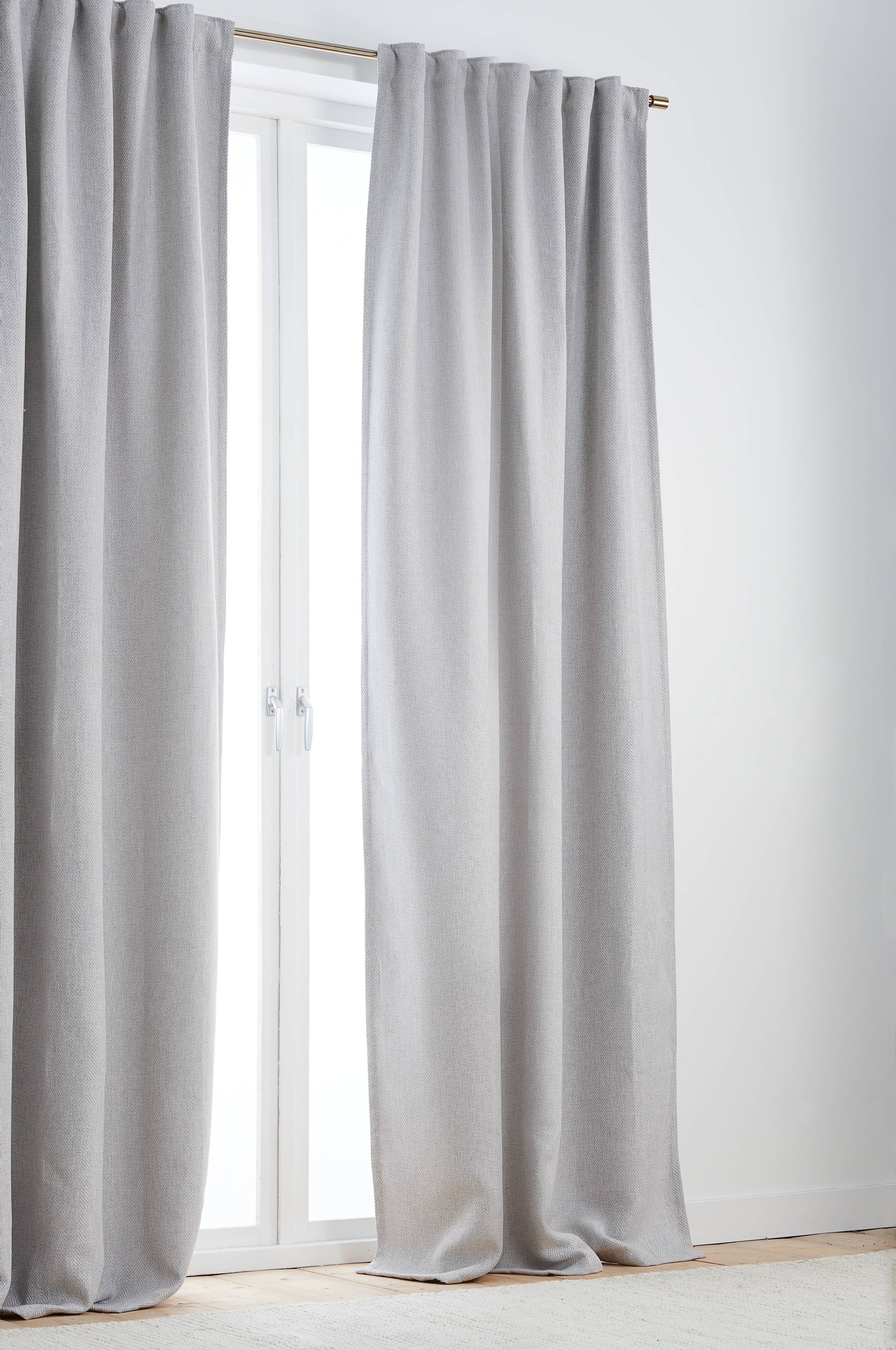 Ensfarget gardinlengde i polyester med påsydd multifunksjonsbånd. Ensfarget roer ned samtidig som det skaper en hjemmekoselig følelse. Gardinen kan henges opp med fingerkroker, løpegang eller skjult hempe.