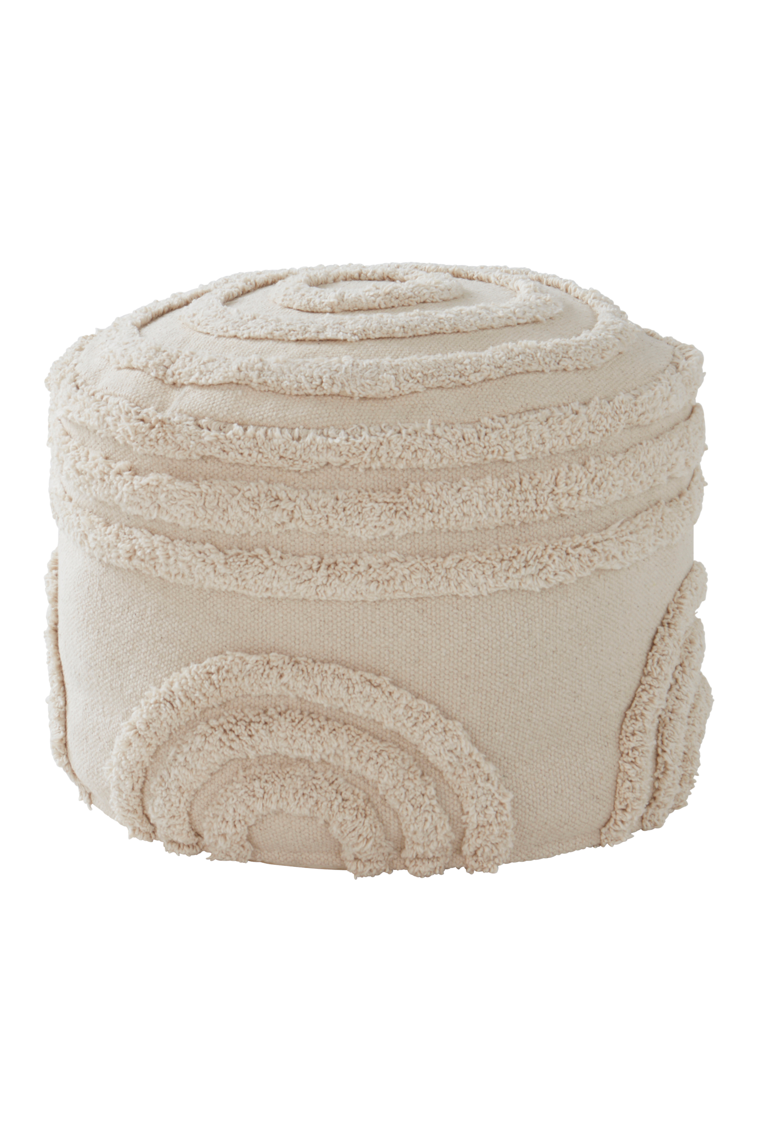 Rund puff av kraftig, vevd stoff med tuftet mønster ton-i-ton. Luggen danner et fint mønster av sirkler. Puffen har innerpute med myk polstring av isoporkuler som former seg behagelig når du sitter på den. Glidelås langs nederkanten, slik at du kan ta av trekket. Lugghøyde 1 cm.