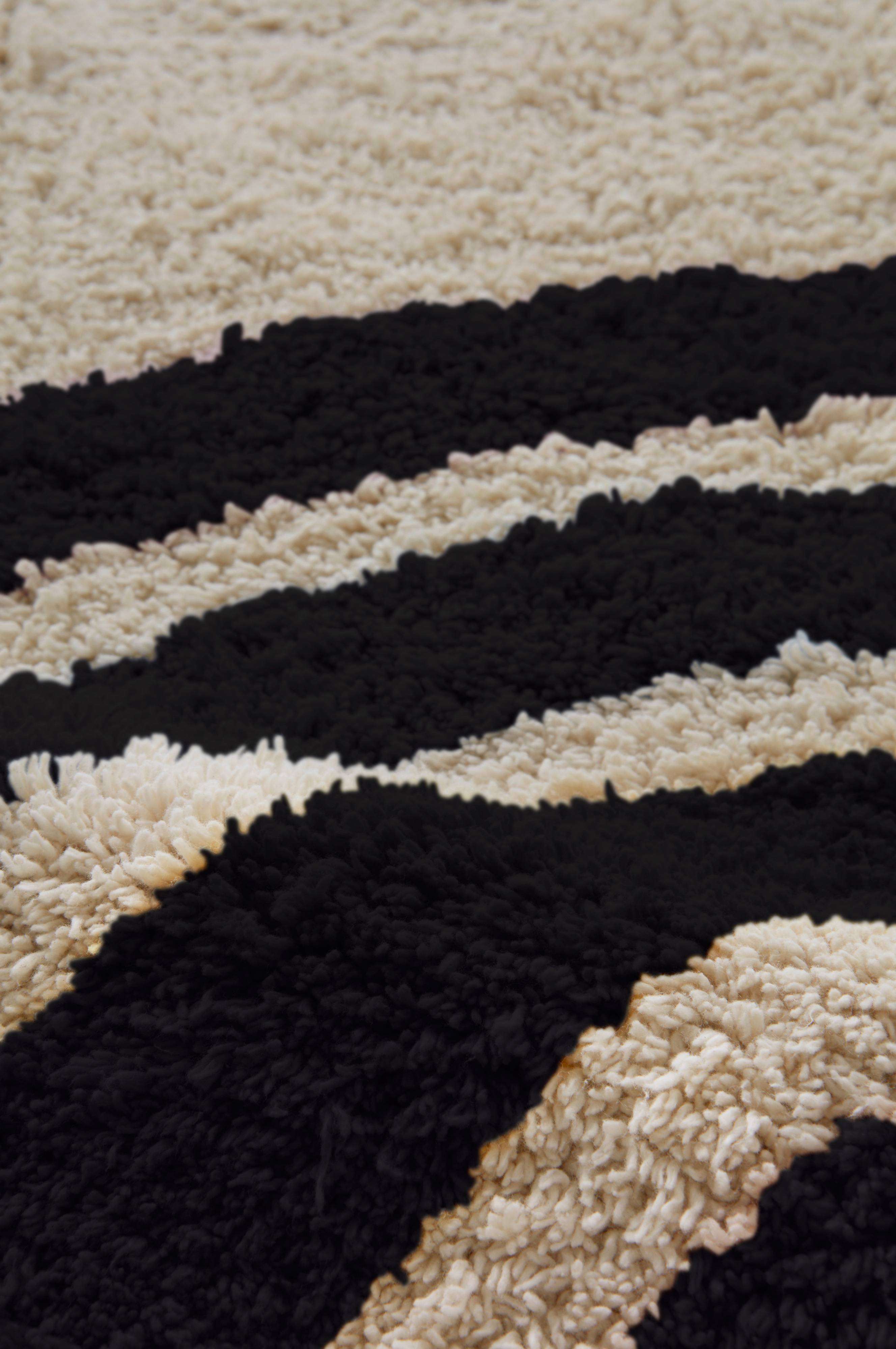 Tuftet teppe av bomull med herlig regnbuemønster i fine farger. Regnbuene har lange frynser knyttet i endene, frynsene går i regnbuens farger. Frynselengde 10 cm. Lugghøyde 1 cm. Tykkelse 1,1 cm. 1500 g/m².