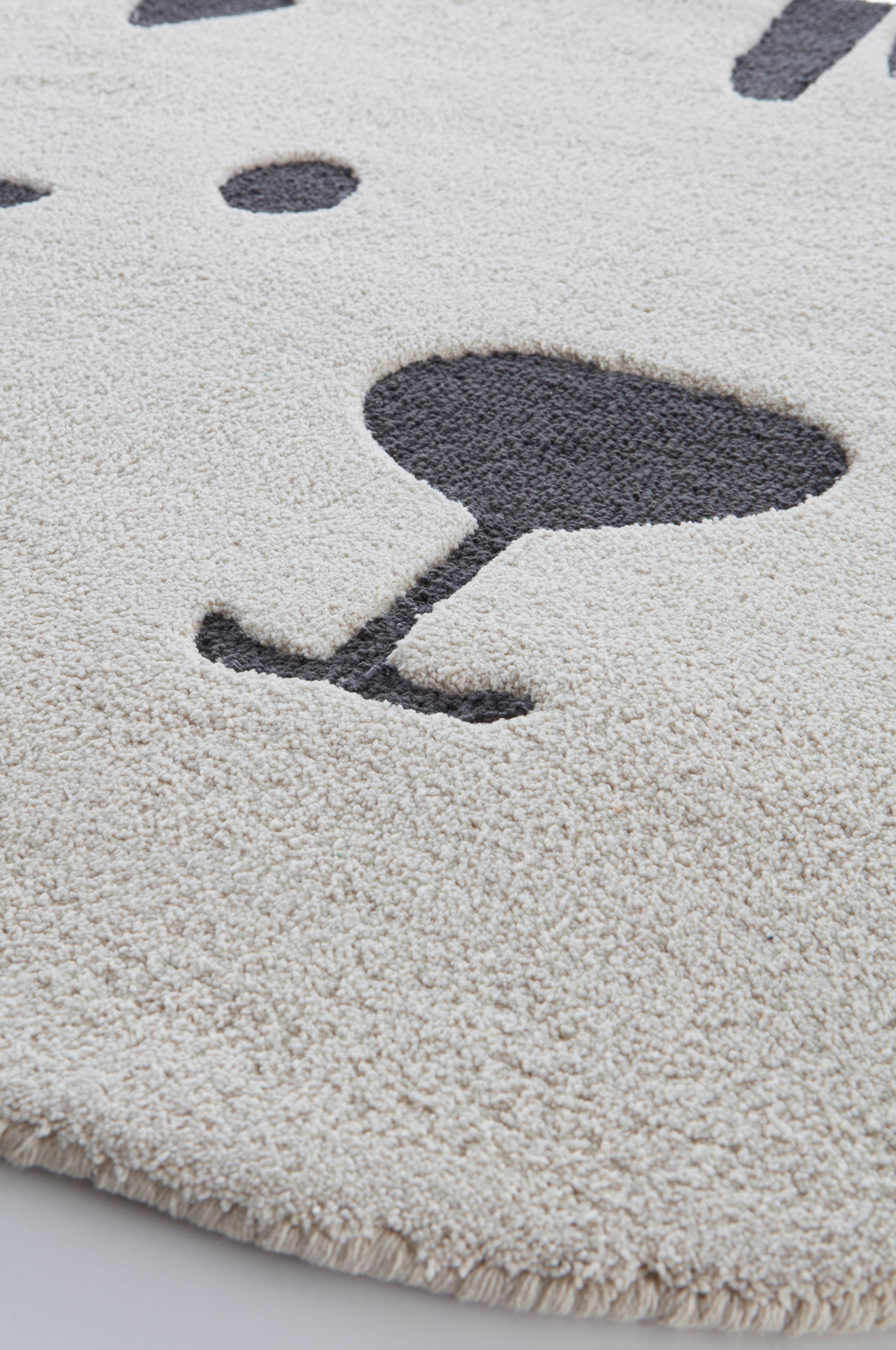 Håndtuftet teppe av økologisk bomull. Det myke, herlige teppet er formet som et søtt dyrefjes. Teppet er perfekt å sitte og leke på. Hvorfor ikke plassere flere små tepper som små øyer på barnerommet? Lugghøyde 0,9-1 cm samt 0,5-0,6 cm. Tykkelse 1,5-1,6 cm. 3000-3200 g/m².