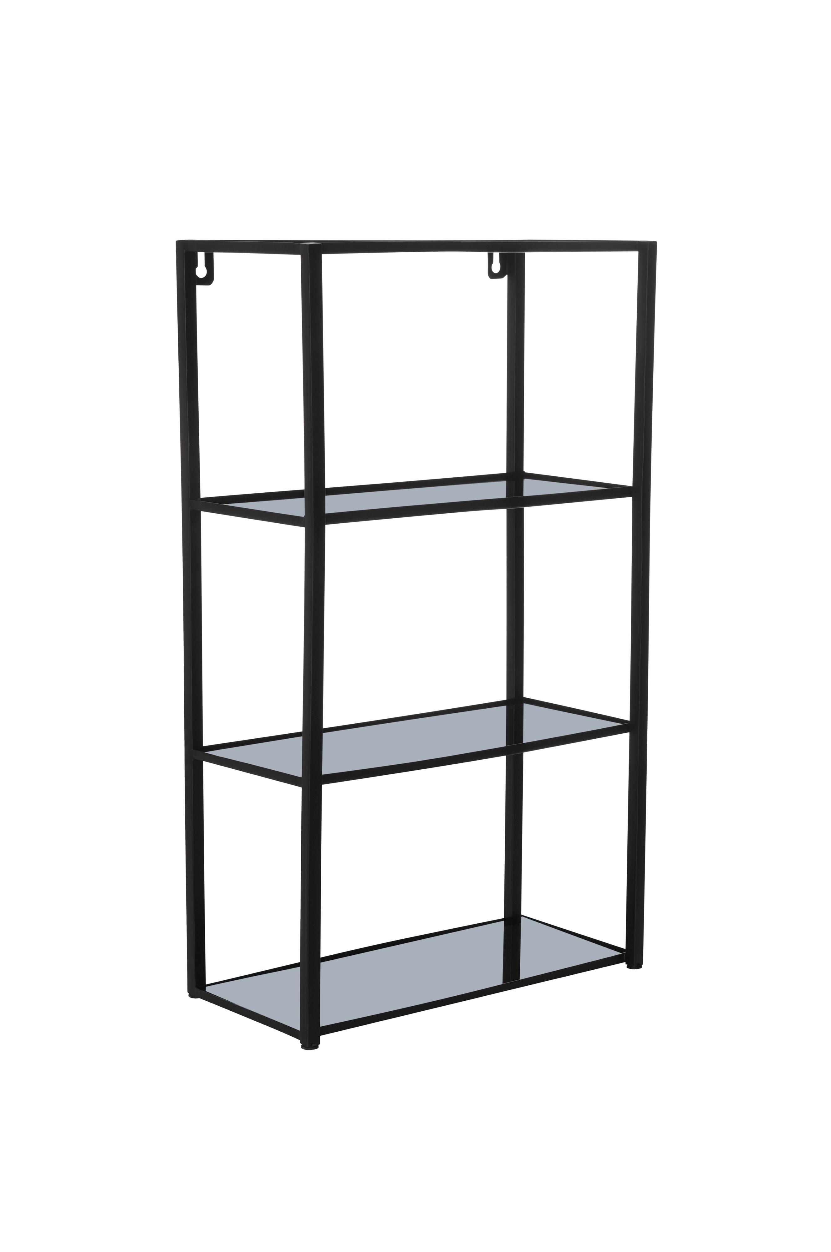 Vegghylle av pulverlakkert metall med hyller i røykfarget glass. Nett og smidig modell med hull for oppheng. Maks. belastning 15 kg.