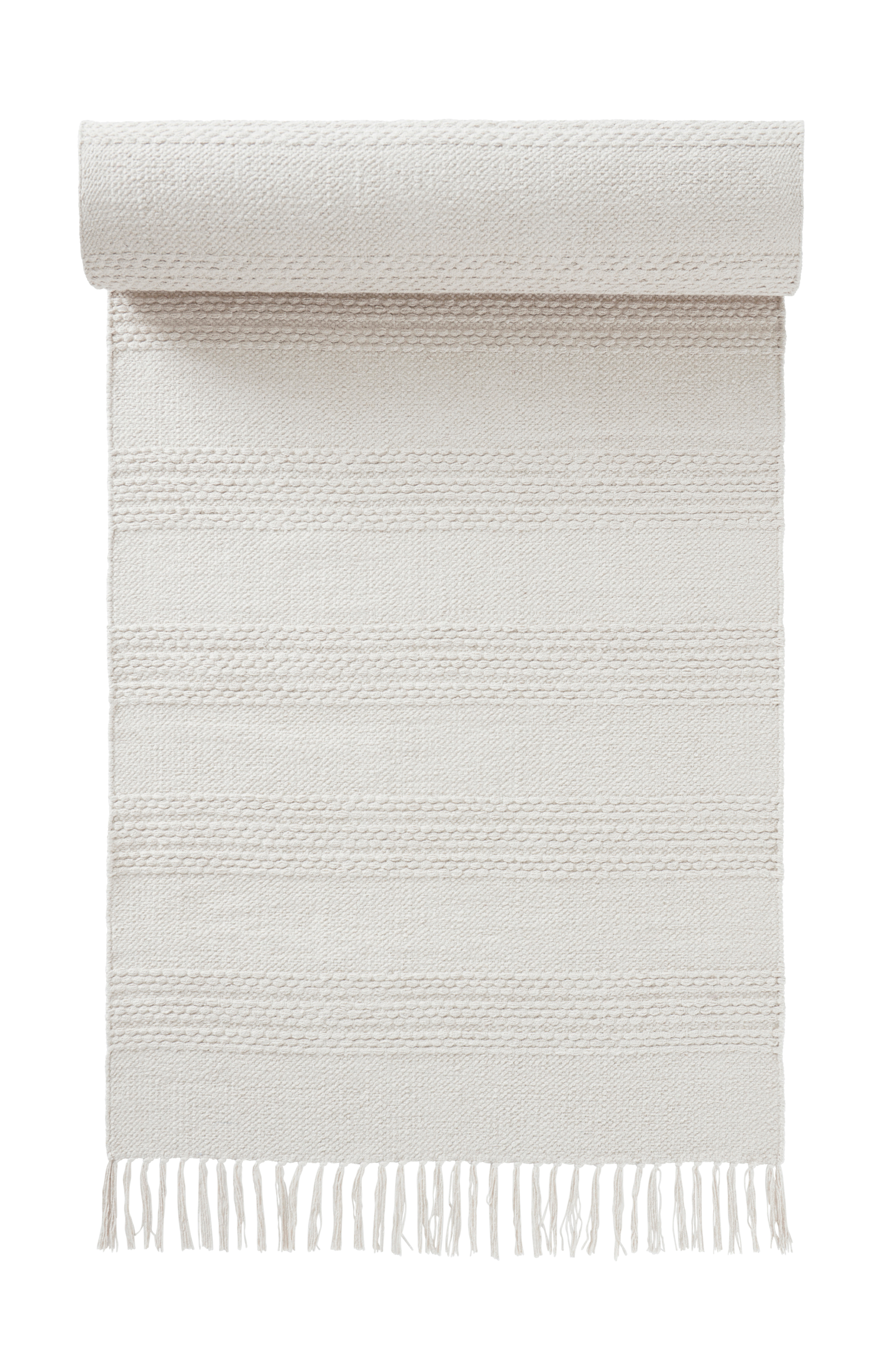 Ensfarget teppe av bomull med vevd teksturstripe ton-i-ton og frynser langs kortsidene. Et klassisk bomullsteppe som passer like fint på kjøkkenet som på barnerommet, gangen eller vaskerommet. TANYA blir en herlig fargeklatt og rommet får en ny utstrålning. Frynselengde 8 cm. Tykkelse 5 mm.