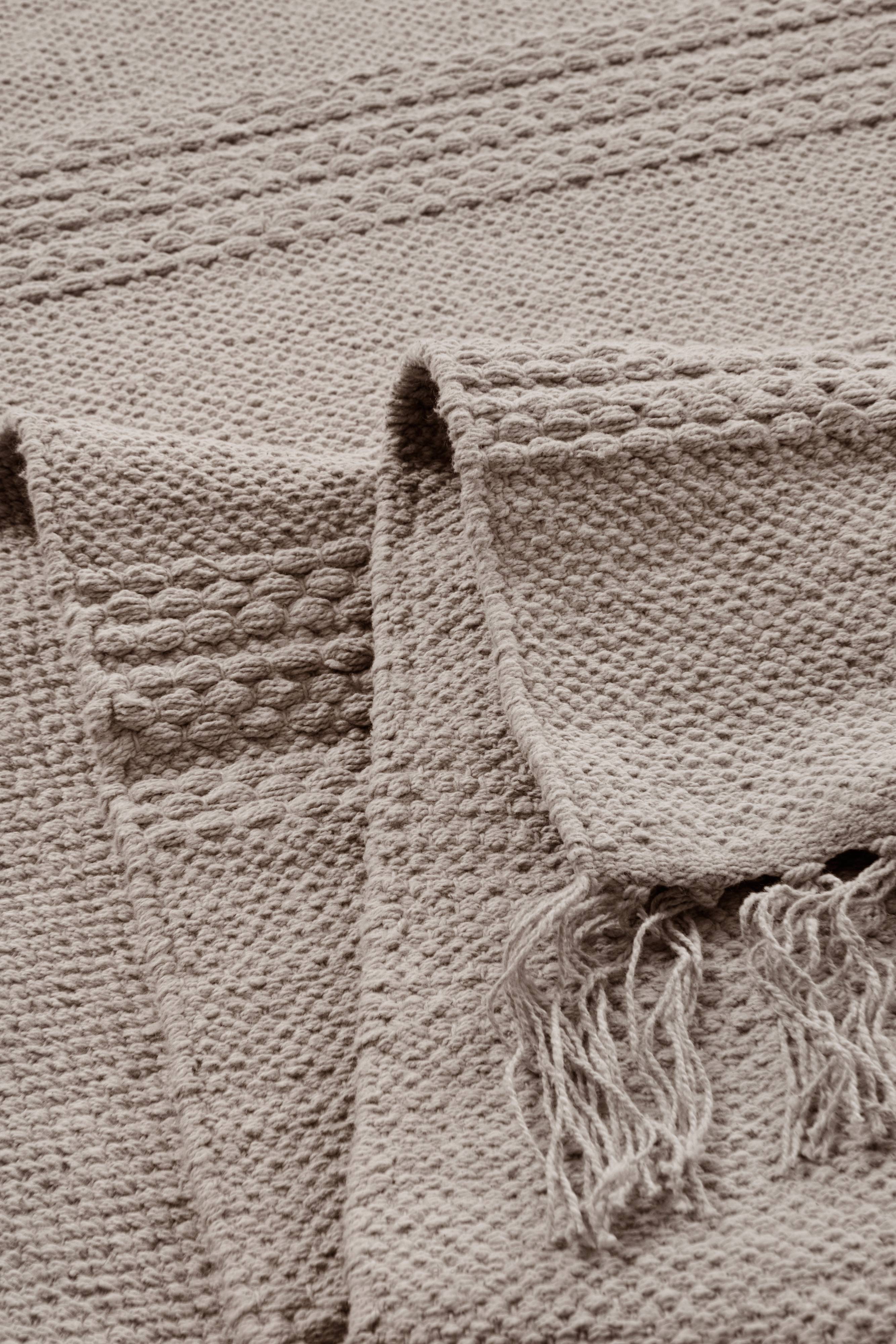 Ganske tynt bomullsteppe. Lyngfargen var ganske grå/beige, men det var bare et pluss! Jeg var redd det ville være for reddit for hjemmet. Vi får se hvordan du oppfører deg når du vasker deg…