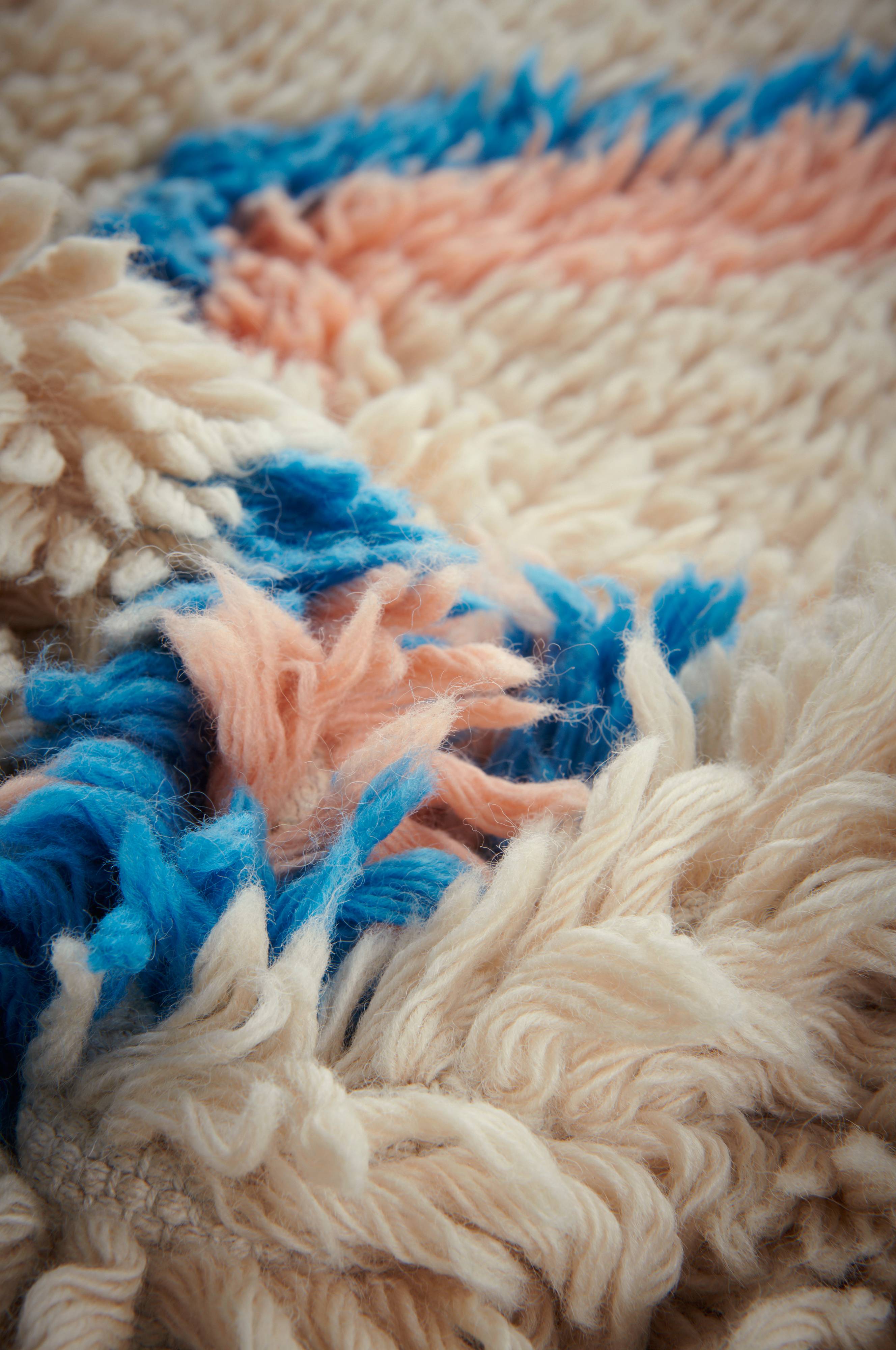 Håndtuftet teppe av garnfarget ull med fint mønster i kvikke farger. Teppet er kraftig og mykt med lang lugg og grov frynsekant. Ull er et naturmateriale som er behagelig å gå på. Lugghøyde 42-45 mm, 2000-2200 g/m². Frynselengde 12-15 cm.