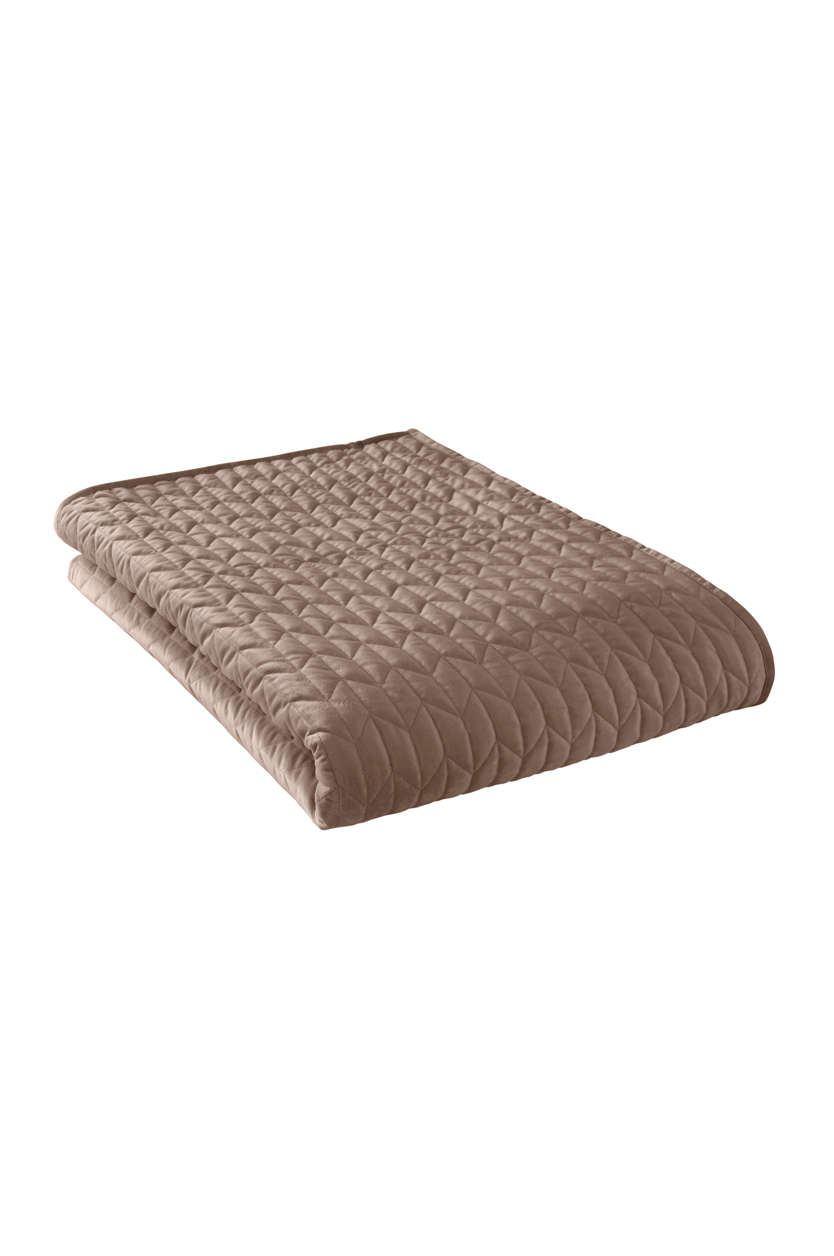 Sengeteppe i quiltet fløyel med dekorative sømmer og piping rundt.