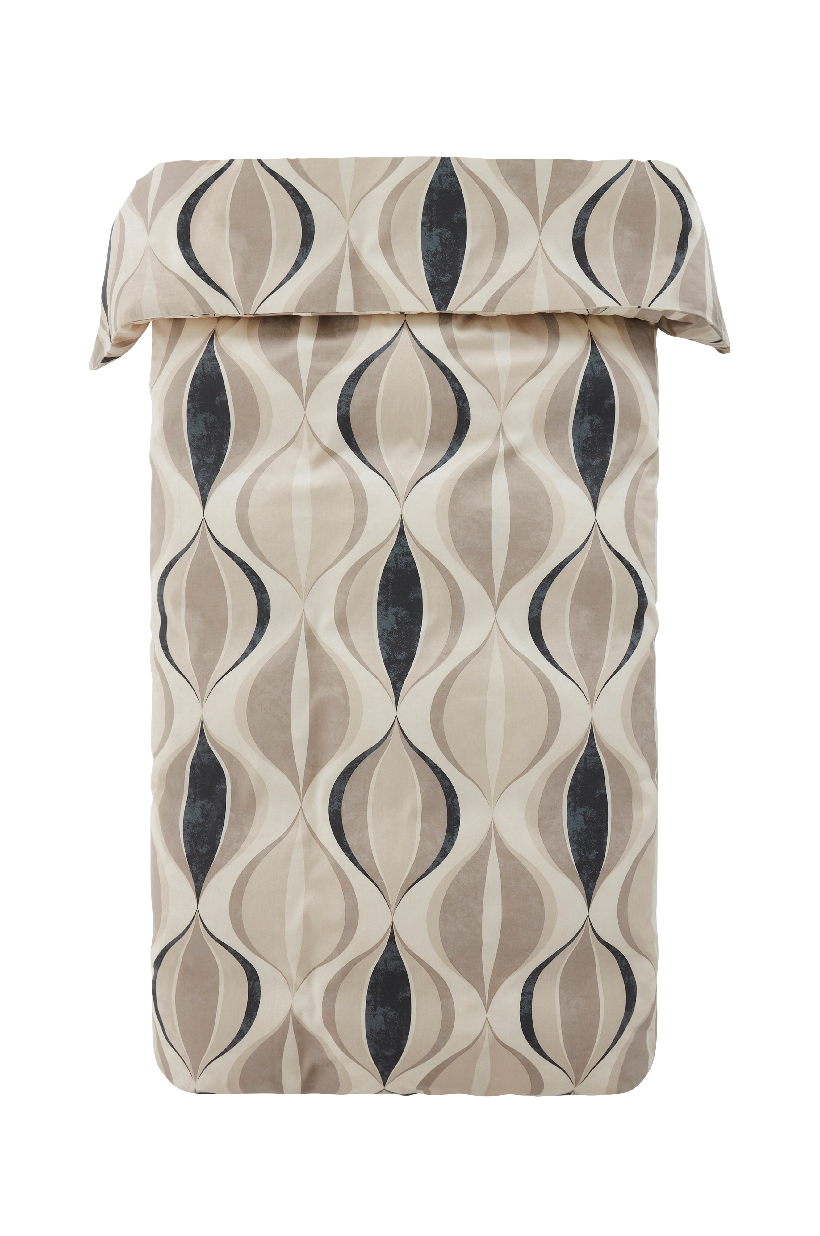 Dynetrekk av bomullssateng med trykt mønster. Dynetrekket lukkes med trykknapper. Sateng er et tett, glatt stoff med fin glans. Trådtetthet på 200 tc. (Trådtettheten forteller om antallet tråder, thread counts, pr. kvadrattomme i et stoff. Jo høyere trådtetthet, desto høyere kvalitet).