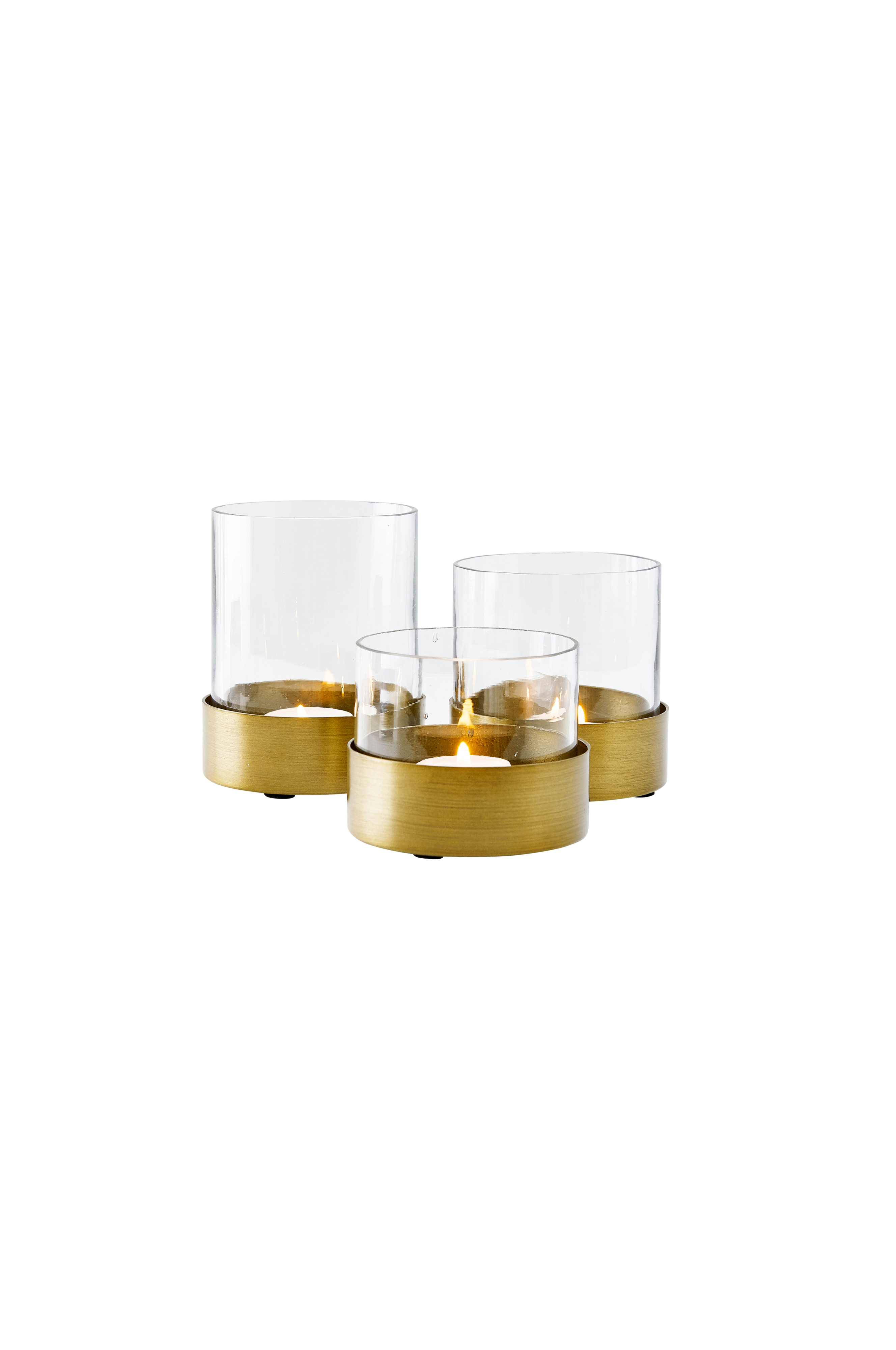 3-pk telysholdere i glass og med aluminiumfot med antikk messing-finish. Lykt med ren design og vakre linjer.