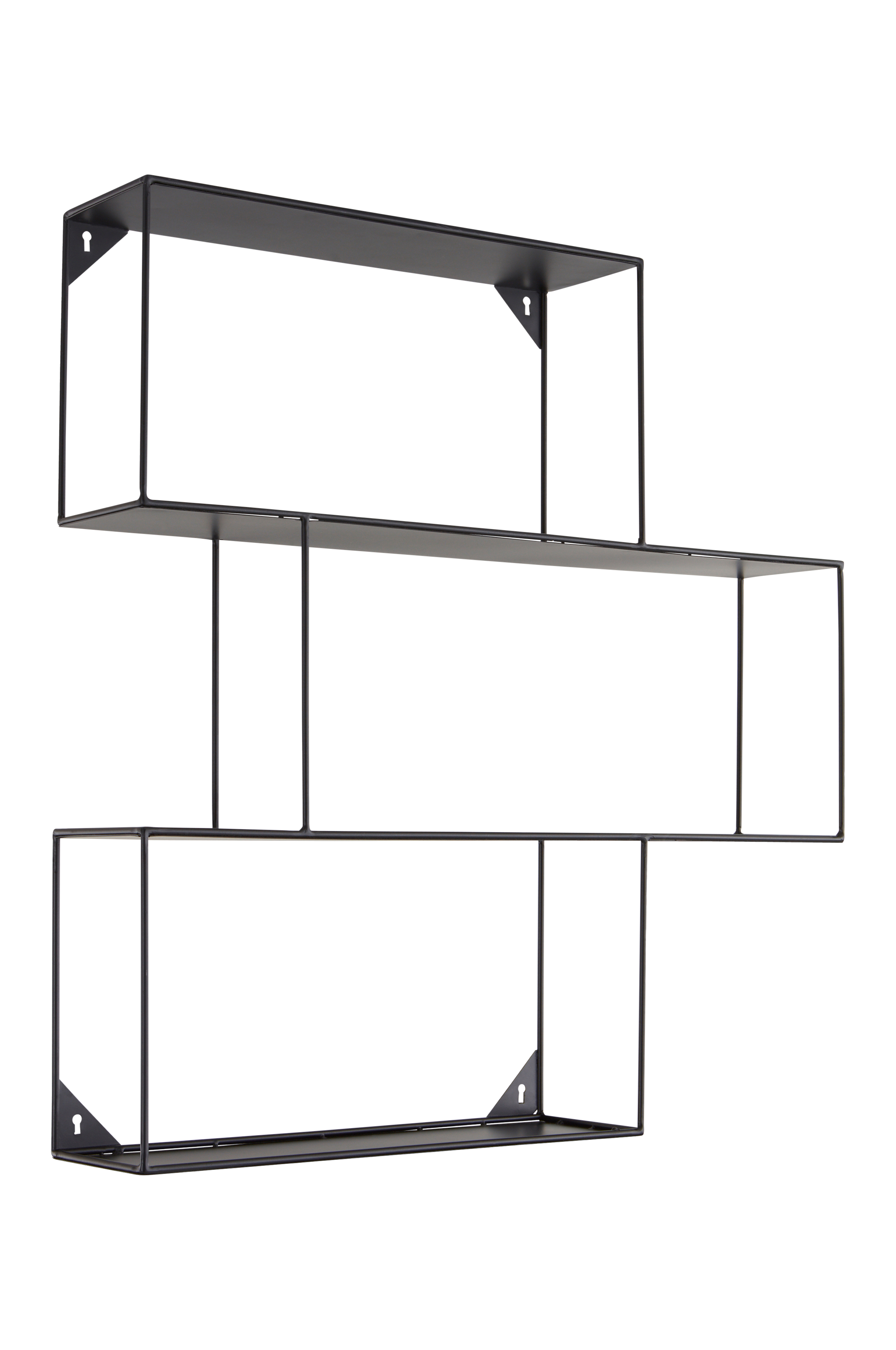 Håndlaget vegghylle i mattsvart, åpen modell med hele hyller som er forskjøvet i forhold til hverandre. Hele hyllen er av jern. Hull for oppheng. Håndverket gjør hver hylle unik.