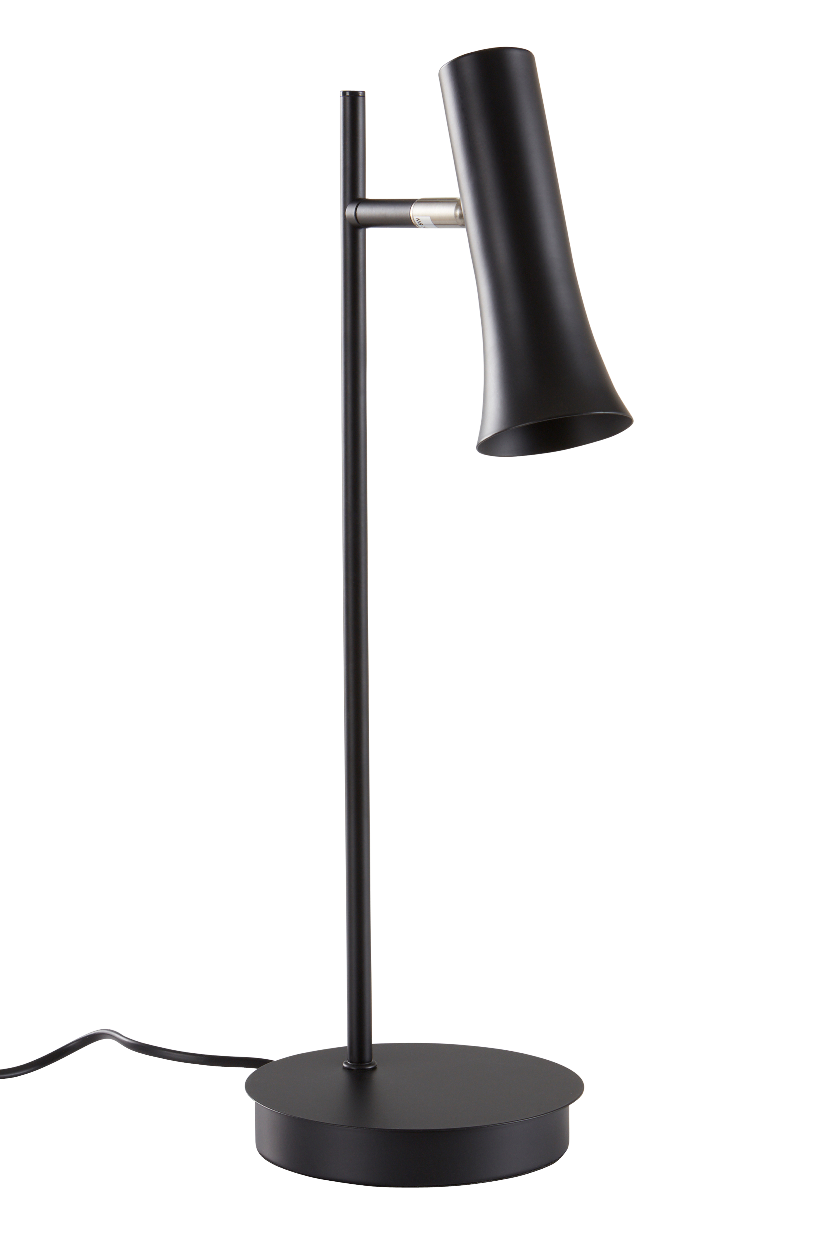 Bordlampe av metall med liten og smidig lampeskjerm som gir godt leselys. Lampen er stilren og lettplassert, perfekt på skrivebordet eller nattbordet. Ledningen er transparent.