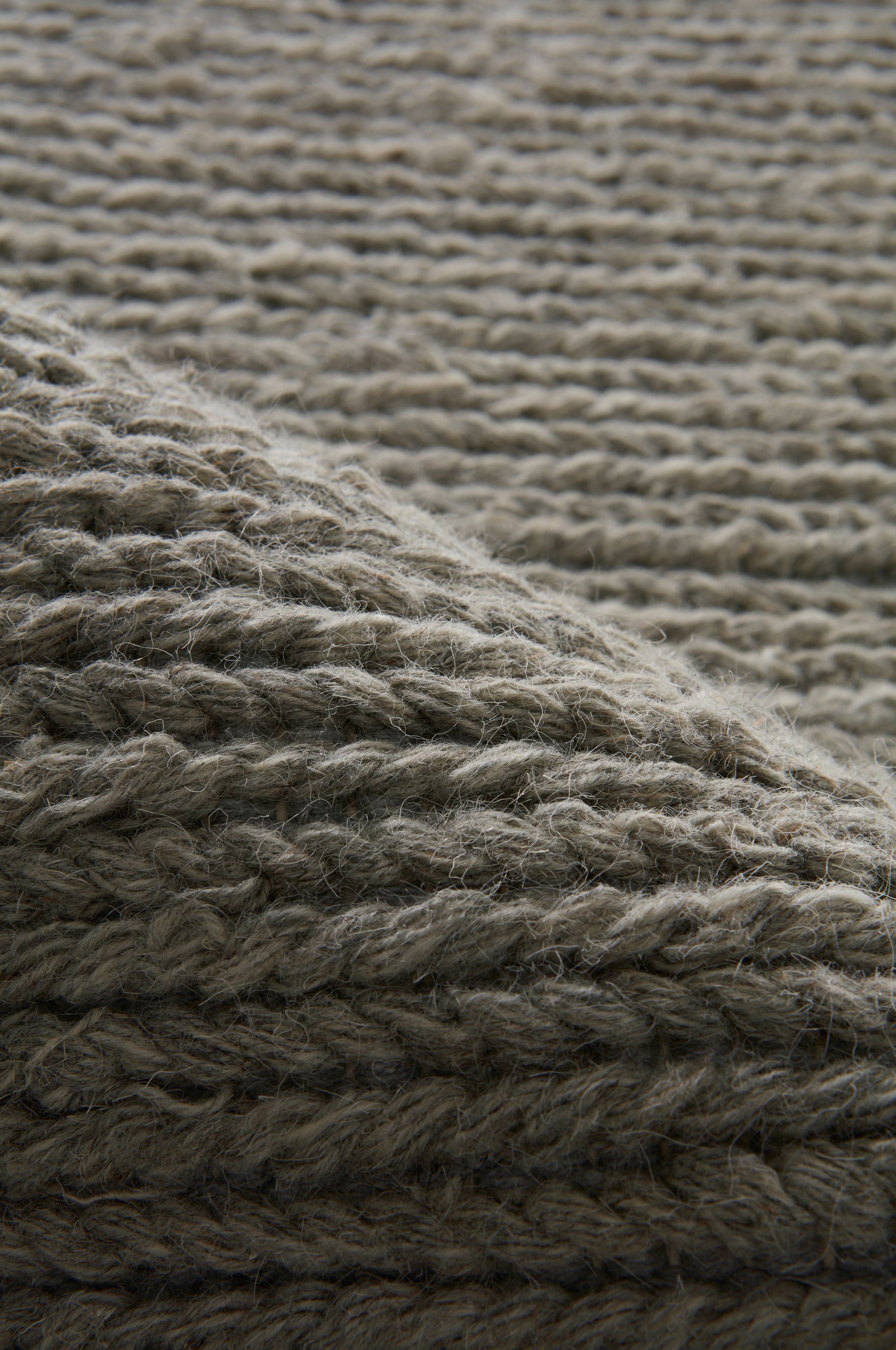 Håndvevd teppe av ull. Teknikken som er brukt ved vevingen gjør at teppet ser ut som det har en flettet overside. Teppet er av varm og myk ull. Et håndvevd teppe er et fint håndverk, og hvert teppe er unikt. Tykkelse 1,2 cm. 2400 g/m².