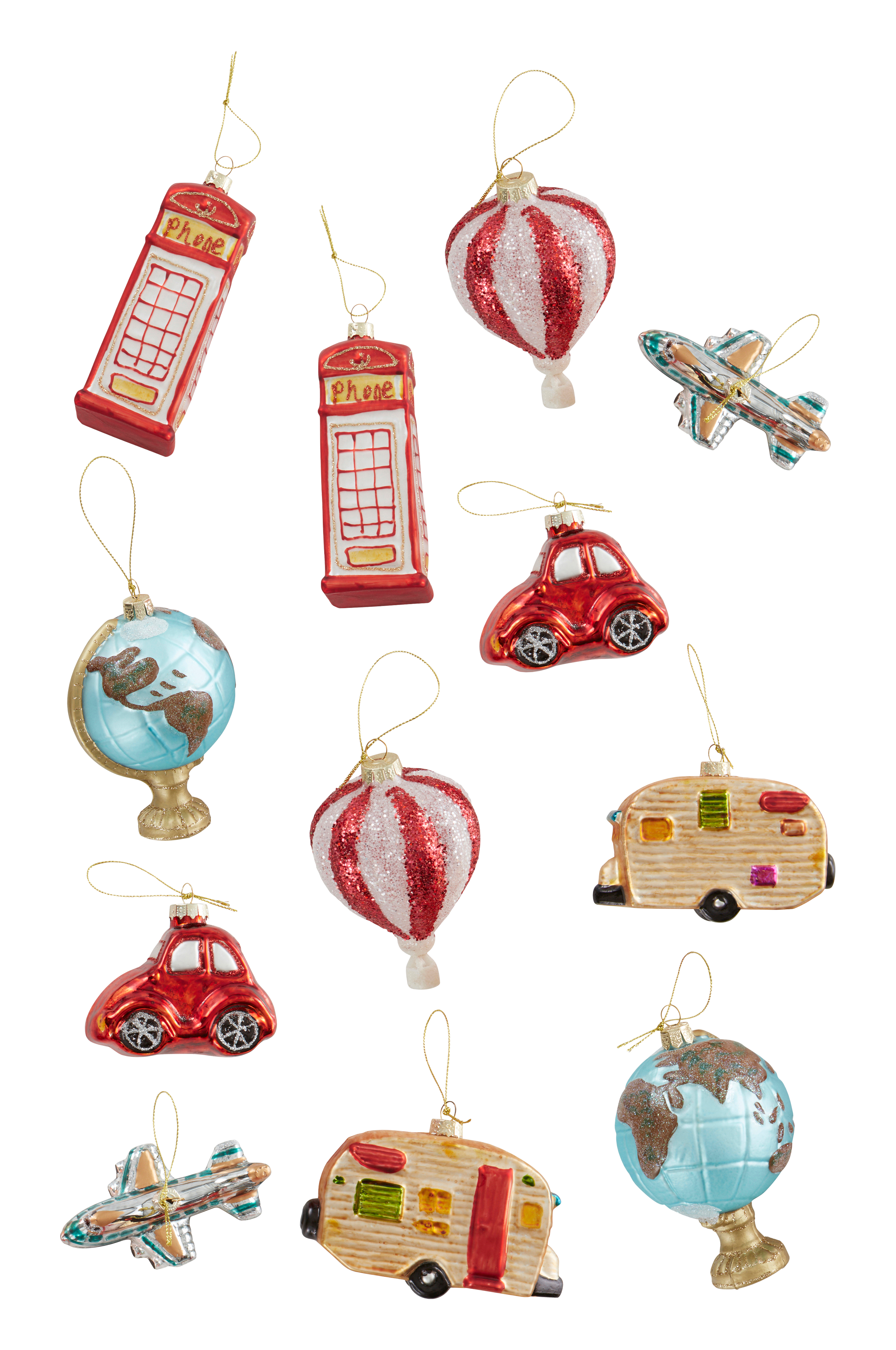 12-pk dekorative anheng av glass. Figurene skaper drømmer for en sann globetrotter. Pakken inneholder seks ulike varianter, to av hver. Alle har en liten snor slik at du kan henge de opp der du vil.