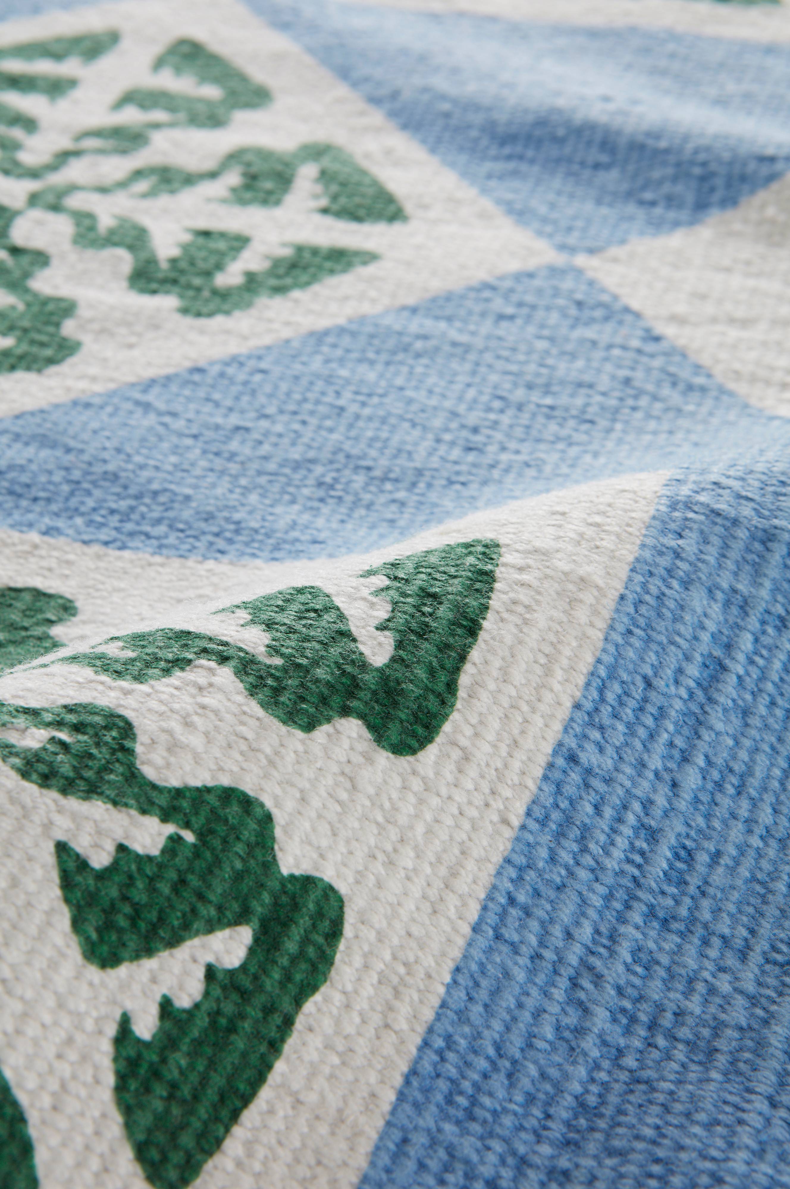 TREELINE er et juletreteppe i unik design av Mikael Selin. Det runde teppet er håndvevd av gjenvunnet polyester. Motivet er trykt i farger som
