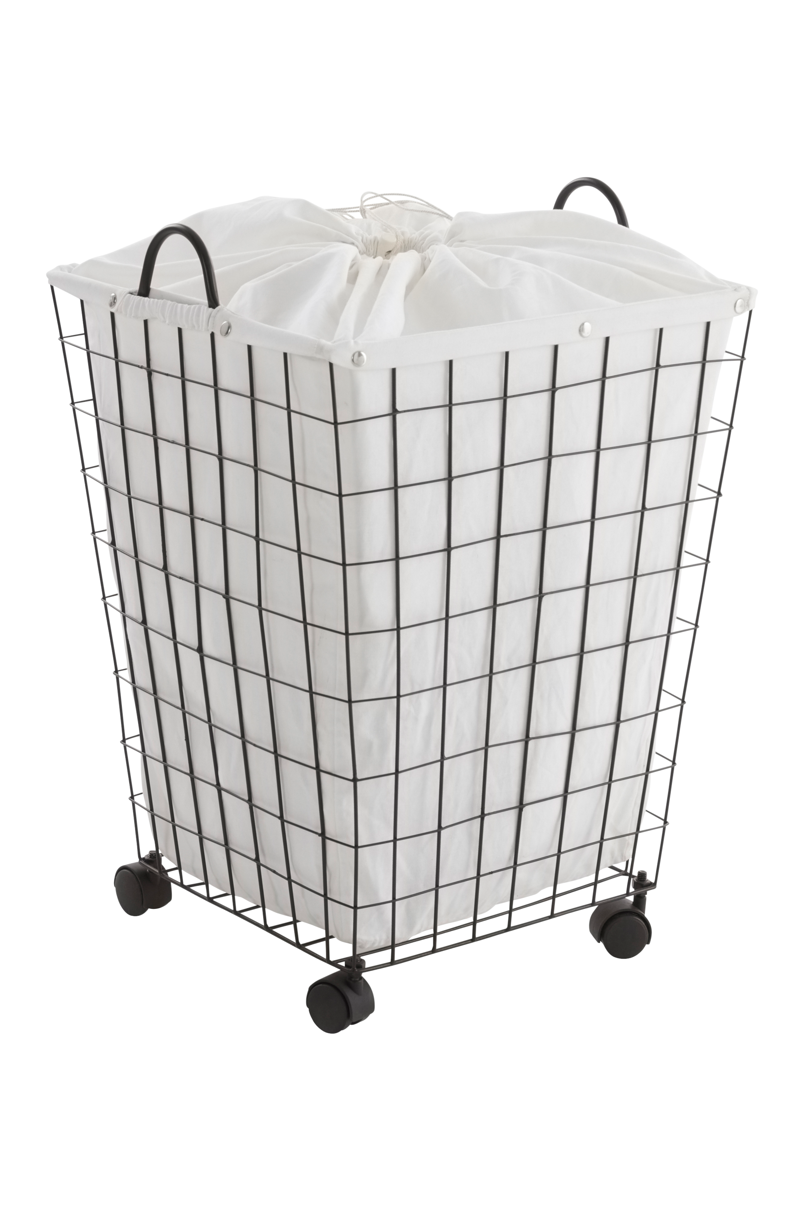 Praktisk skittentøyskurv i firkantet modell lik en trådkurv av jern. Med hjul og to håndtak. Skittentøyskurven er lett å flytte. Bare rull eller løft den. Stoffposen i kurven, som du legger vasken i, er av bomull. Den er vaskbar. Hjul av metall. TRIVENTO er en lett, smidig og romslig skittentøyskurv.