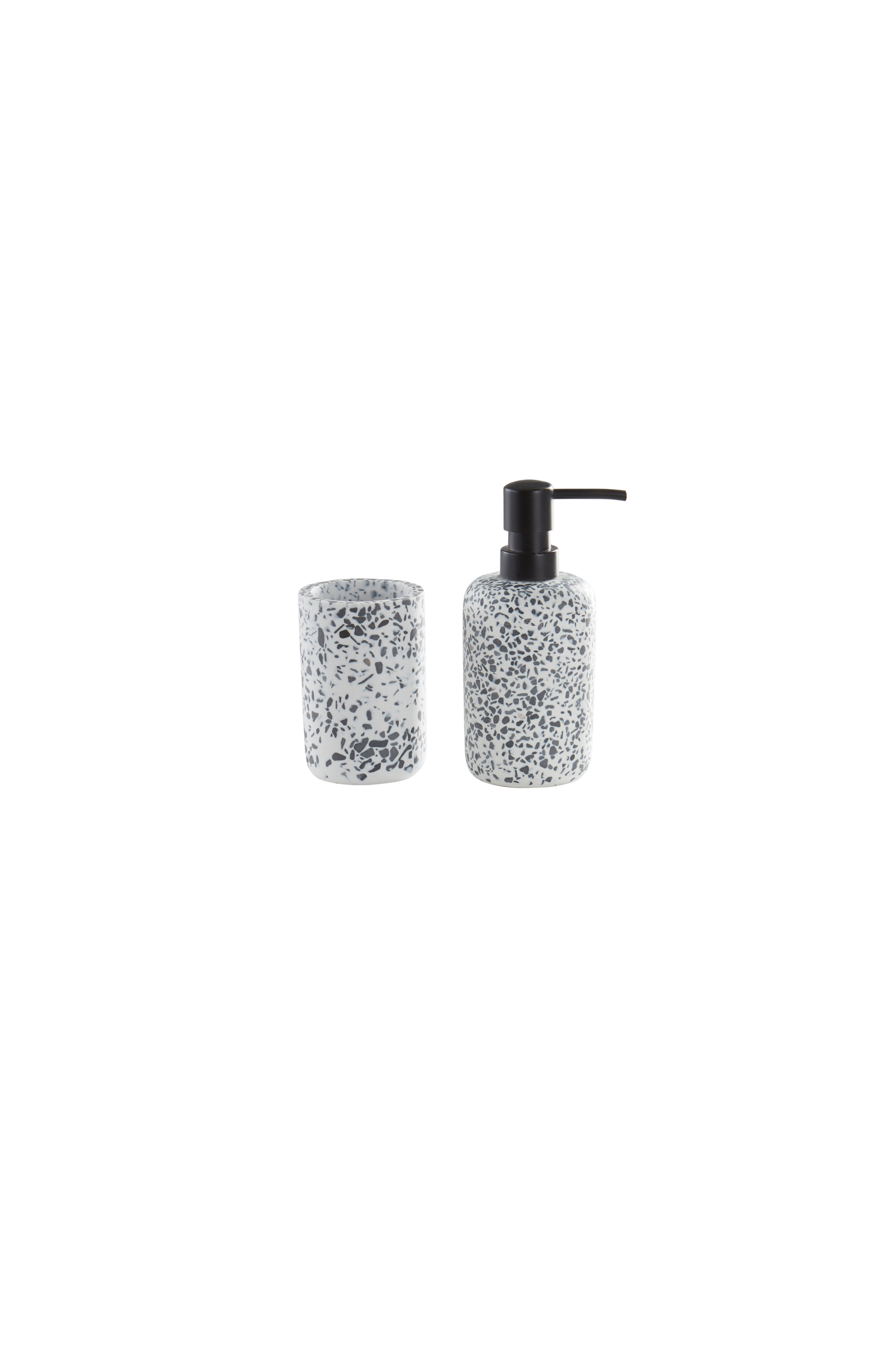 Baderomssett med to deler i polyresin. Settet inneholder et krus og en dispenser med pumpe. Dispenseren fyller du med din flytende favorittsåpe. Det er et bedre miljøvalg å kjøpe refill, da plastmengden reduseres. Den kan også brukes til hudlotion eller sjampo.
