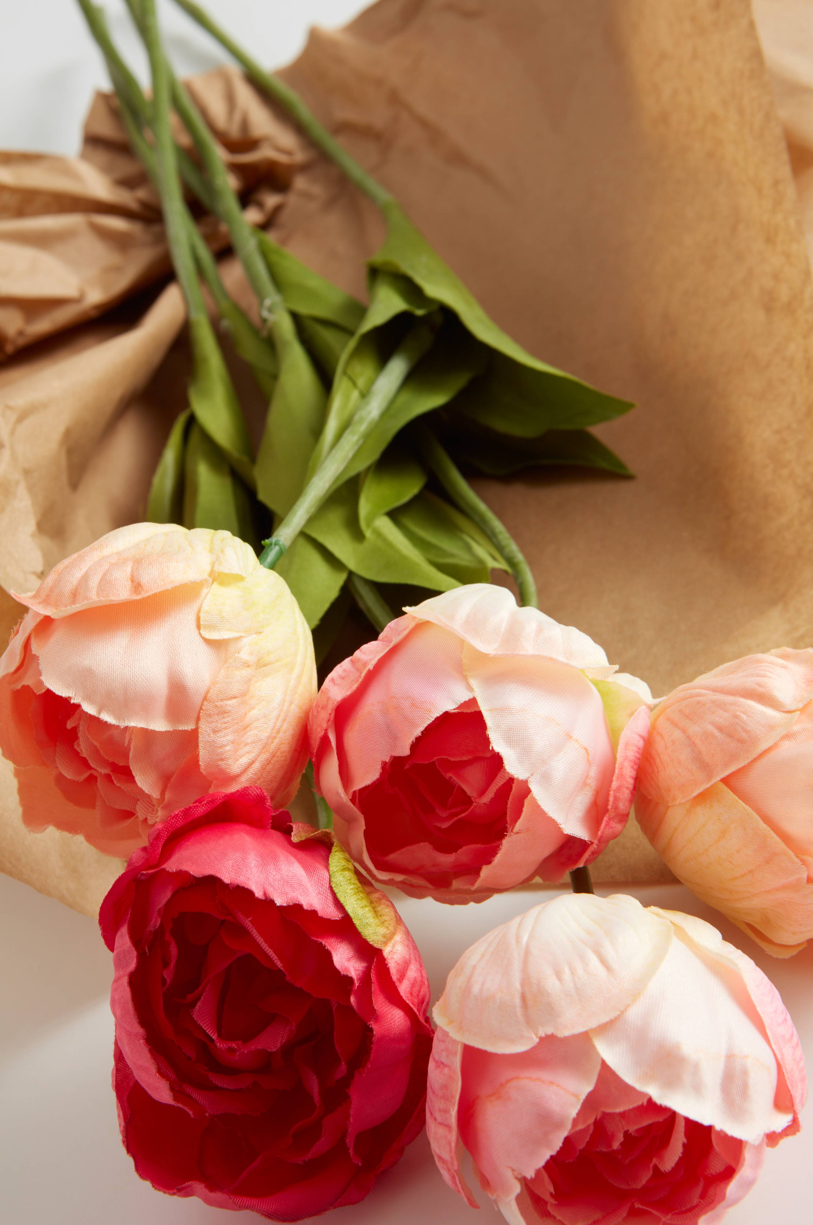 Kunstig bukett med fem vakre tulipaner i rosa farger. Nyansene varierer i respektive bukett. Alle buketter bindes for hånd. Buketten er fantastisk naturtro, og 20% av materialet er polyester fra gjenvunnet materiale. Buketten er pakket inn i silkepapir. En kunstig bukett er vakker lenge og visner aldri.