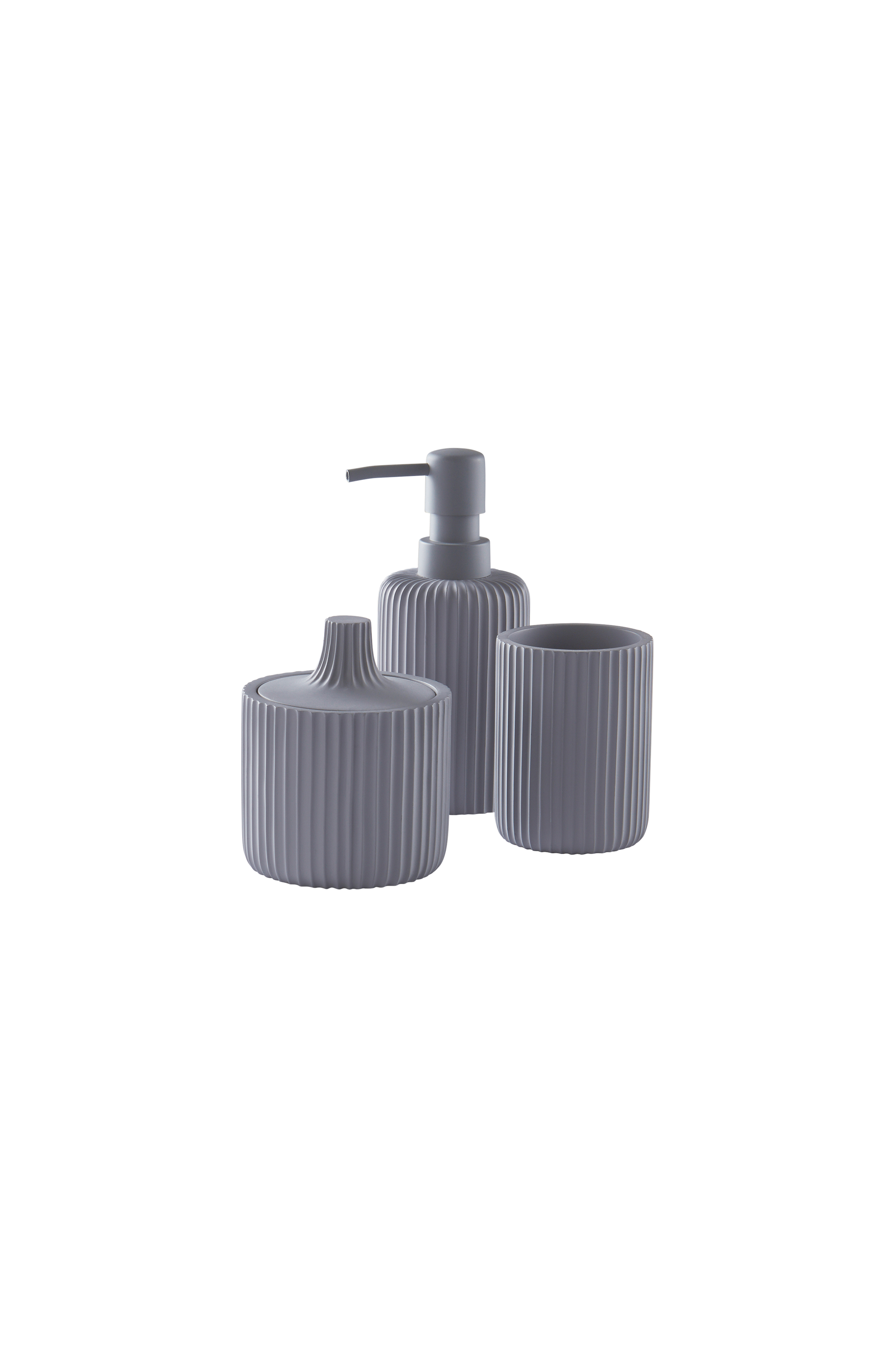 Baderomssett med tre deler i polyresin. Det fine baderomssettet er helt ensfarget med strukturstriper, og er i et lett og solid materiale som passer på badet. Settet inneholder et krus, boks med lokk og en dispenser med plastpumpe. Dispenseren fyller du med din flytende favorittsåpe. Det er et bedre miljøvalg å kjøpe refill da plastmengden reduseres. Den kan også brukes til hudlotion eller sjampo.