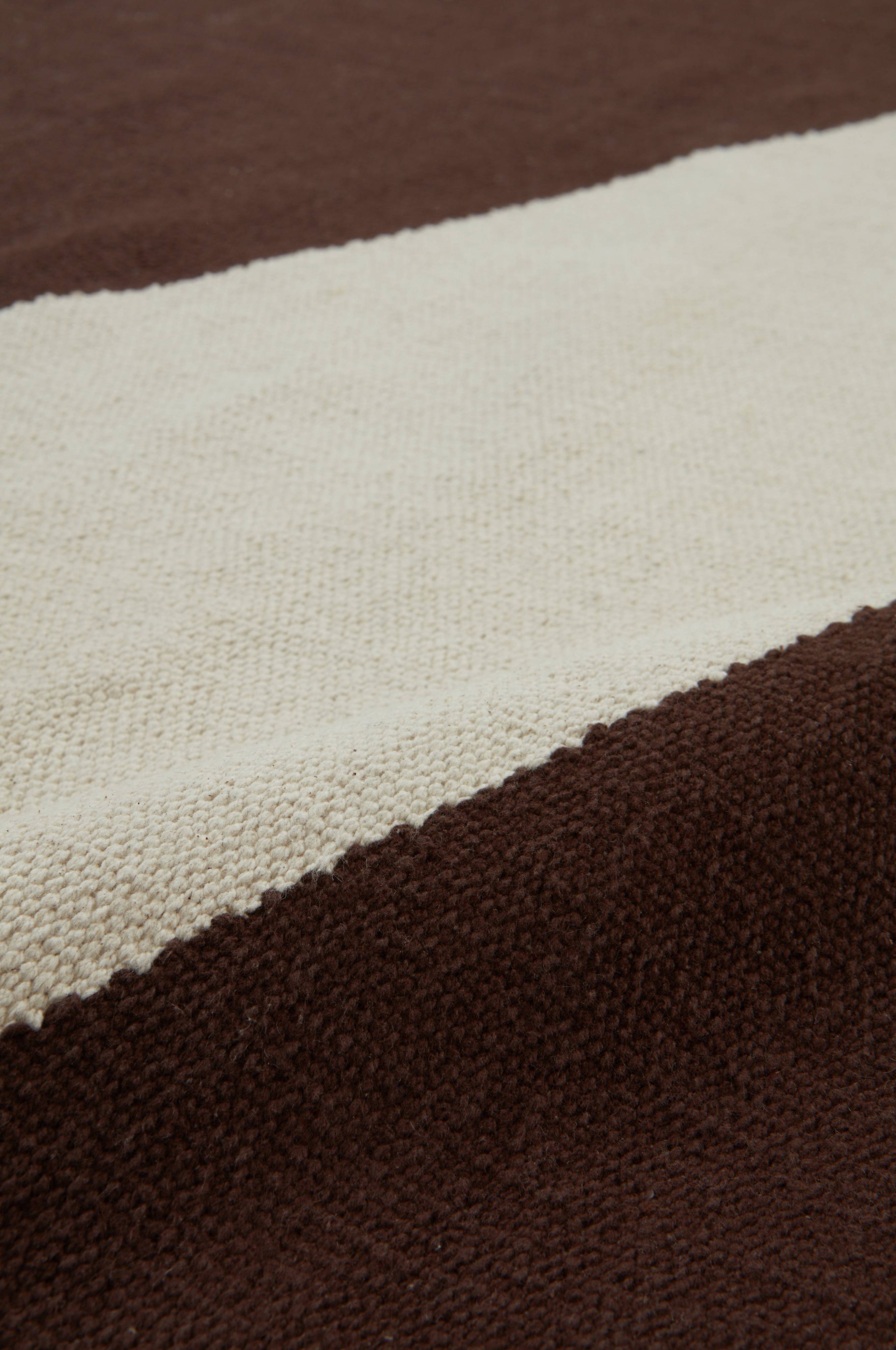 Håndvevd, glattvevd bomullsteppe med garnfarget mønster som skapes av trekanter. Tykkelse 0,5 cm. 910 g/m².