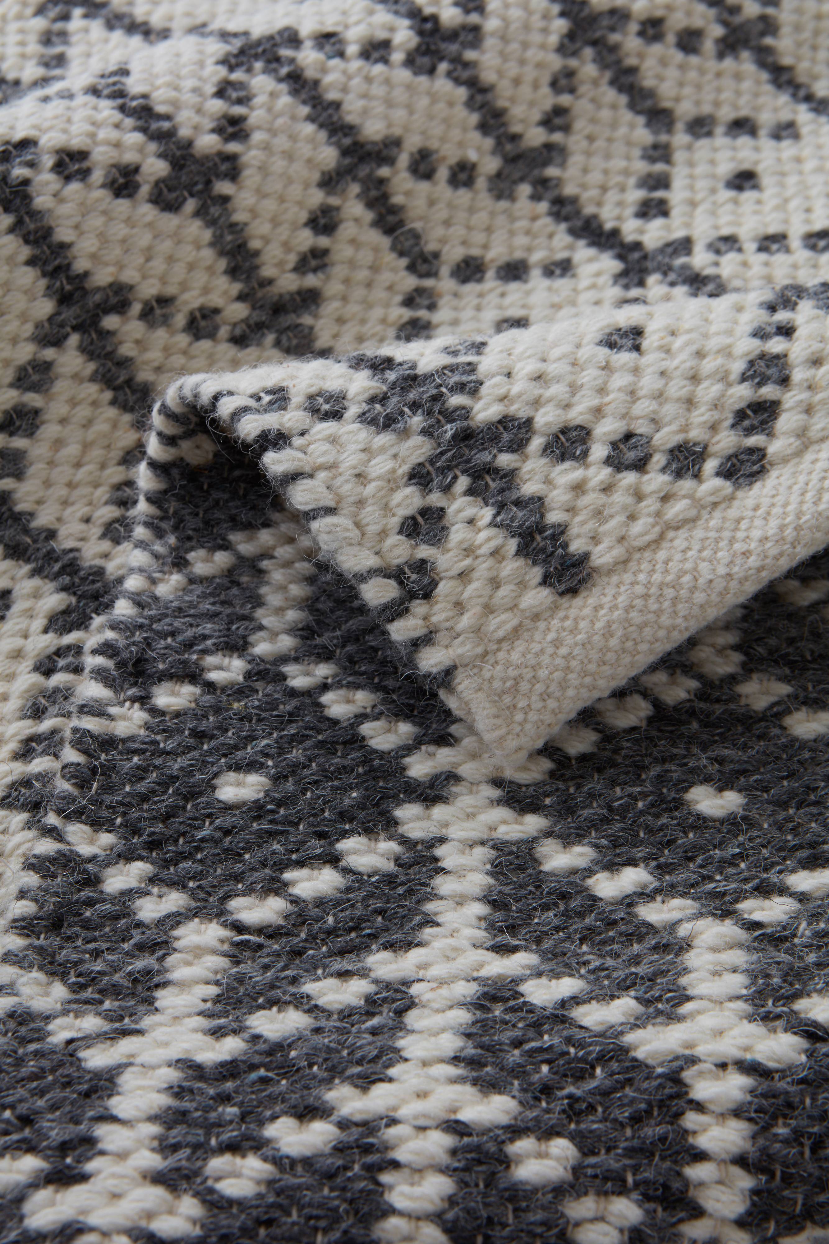 Håndvevd ullteppe med iblandet bomull. WADI har fint vevd mønstereffekt i to farger. Kanten langs kortsidene er glattvevd og langsidene har lasket kant i et grovere garn. Ull er naturlig varmende. Tykkelse 0,5 cm. 1560 g/m².