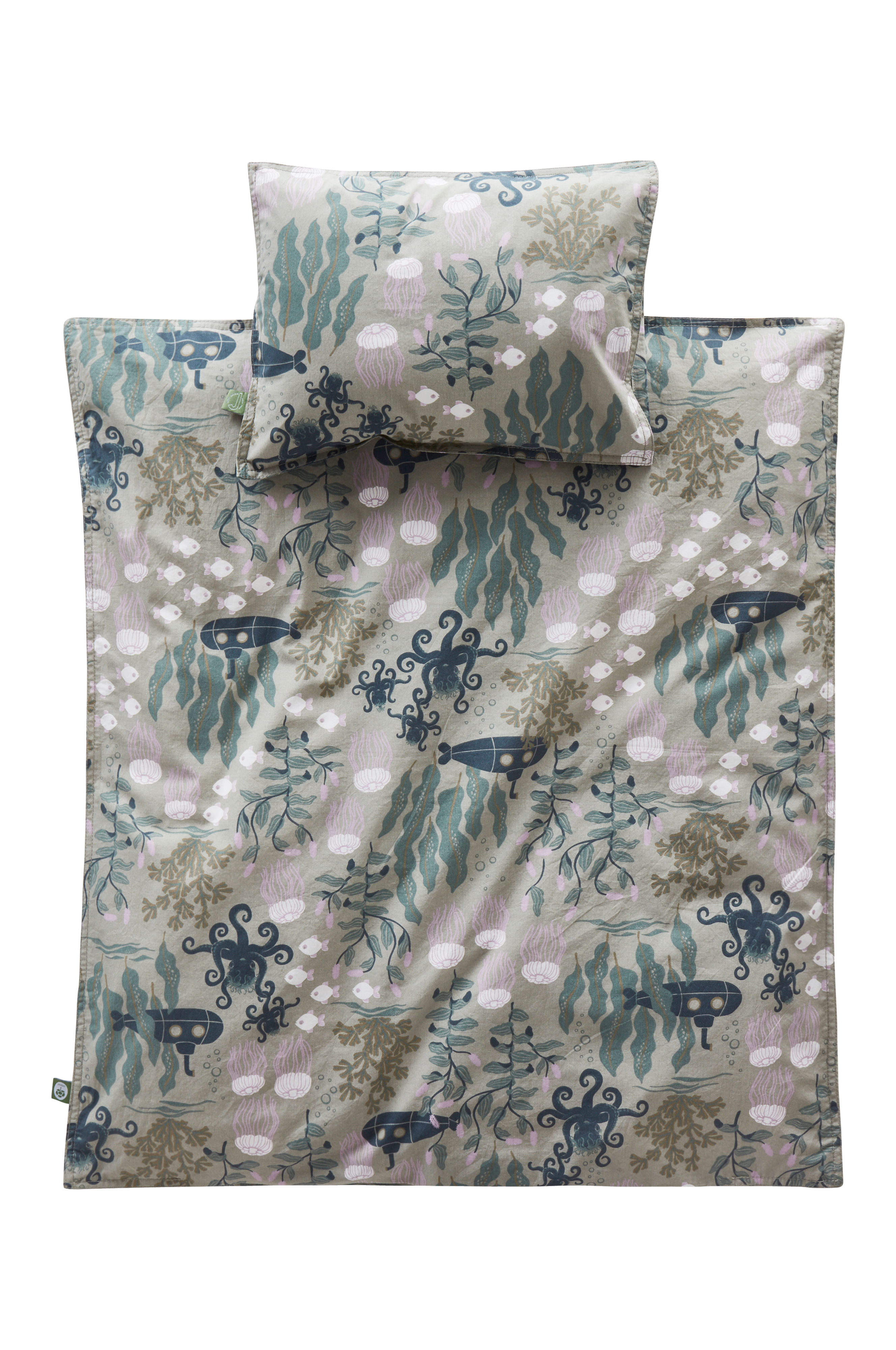 Sengesett i 2 deler som passer perfekt i barnevognen og vuggen. Settet er i herlig percale av økologisk bomull med trykt mønster designet av Maria Carlberg. Det herlige mønsteret er inspirert av et eventyrliv under vannflaten, og fargene er rolige og harmoniske. WATERS er en fin kolleksjon som gir rom for fantasi. Percale er et ekstra mykt og deilig stoff som veves med tynne, fine bomullstråder. Trådtetthet på 200 tc. (Trådtettheten forteller om antallet tråder, thread counts, pr. kvadrattomme i et stoff. Jo høyere trådtetthet, desto høyere kvalitet.)