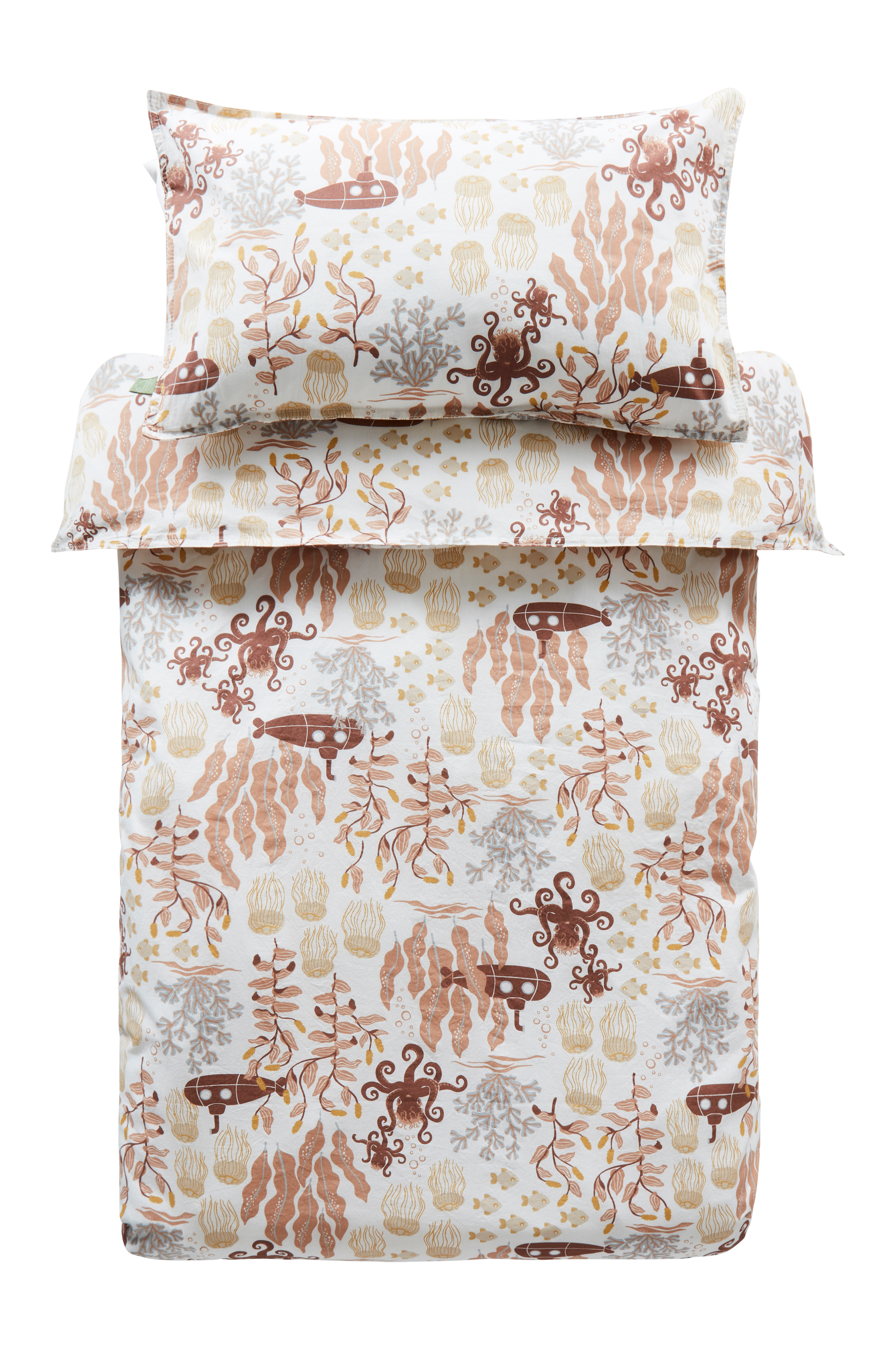 Sengesett i 2 deler som passer perfekt i sprinkelsengen. Settet er i herlig percale av økologisk bomull med trykt mønster designet av Maria Carlberg. Det herlige mønsteret er inspirert av et eventyrliv under vannflaten, og fargene er rolige og harmoniske. WATERS er en fin kolleksjon som gir rom for fantasi. Mønsteret er trykt slik at motivet er i riktig retning når barnet sitter i sengen. Percale er et ekstra mykt og deilig stoff som veves med tynne, fine bomullstråder. Trådtetthet på 200 tc. (Trådtettheten forteller om antallet tråder, thread counts, pr. kvadrattomme i et stoff. Jo høyere trådtetthet, desto høyere kvalitet.)